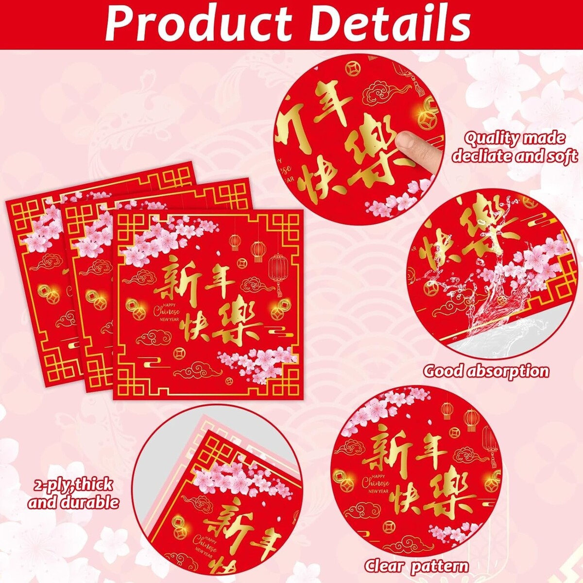 Includes 24 pcs 9 inch dinner plates, 24 pcs 7 inch dessert plates, 24 pcs spring festival party napkins, and 24 pcs red plastic forks.