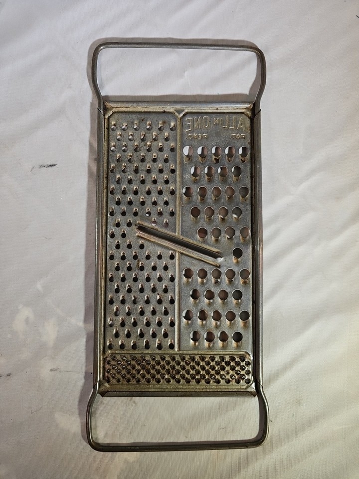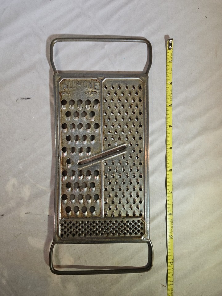 This vintage All-in-one Cheese Grater from the 1930s is a unique and rare kitchen tool that combines a cheese grater with a handle in one compact piece. Made in the USA, this metal grater features a rectangular shape and a silver color, adding a touch of nostalgia to any kitchen collection. Perfect for grating cheese and vegetables, this antique piece measures 10-15 inches in length and 4 inches in height, making it a practical and functional addition to any cooking enthusiast's arsenal.