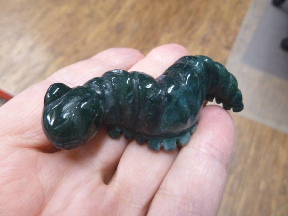 (internal #Y-CATE-714) Excellent carving of a CATERPILLAR or INCH WORM in polished, natural GREEN BLACK JASPER gemstone. Carving is 2-1/2" long, hand-carved in China. New, no defect. Great for the caterpillar or worm collector!