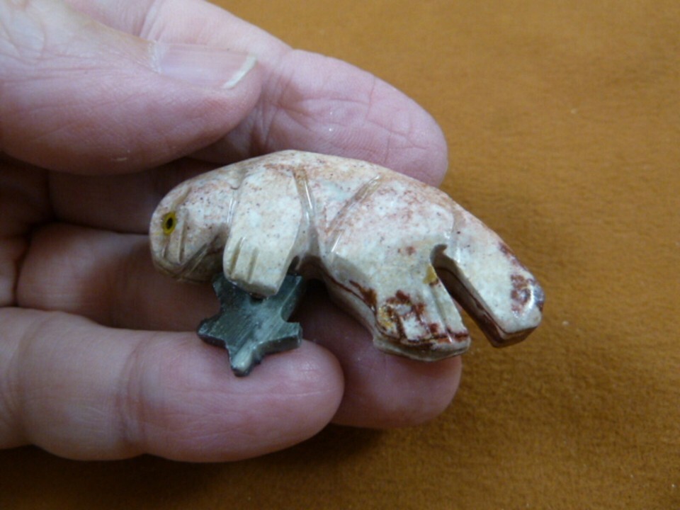(Internal #Y-OTT-5) Cute, little SEA OTTER holding STARFISH or SEA STAR carving, carved in Peru of native soapstone (TAN RUST RED GRAY WHITE coloring is natural). New, no defect, 1-5/8" wide.