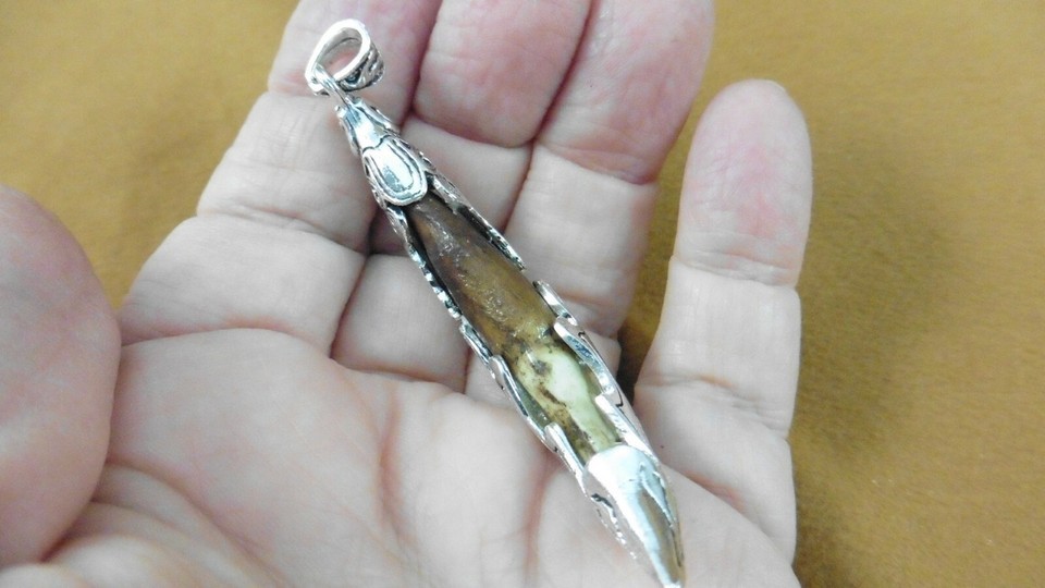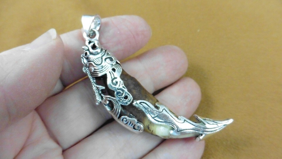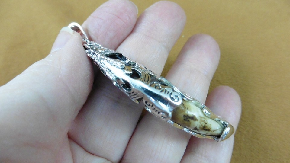 AK-TOOTH-93) 2-1/2" Fossil 1000 yrs old Wolf tooth silver filigree flame pendant
