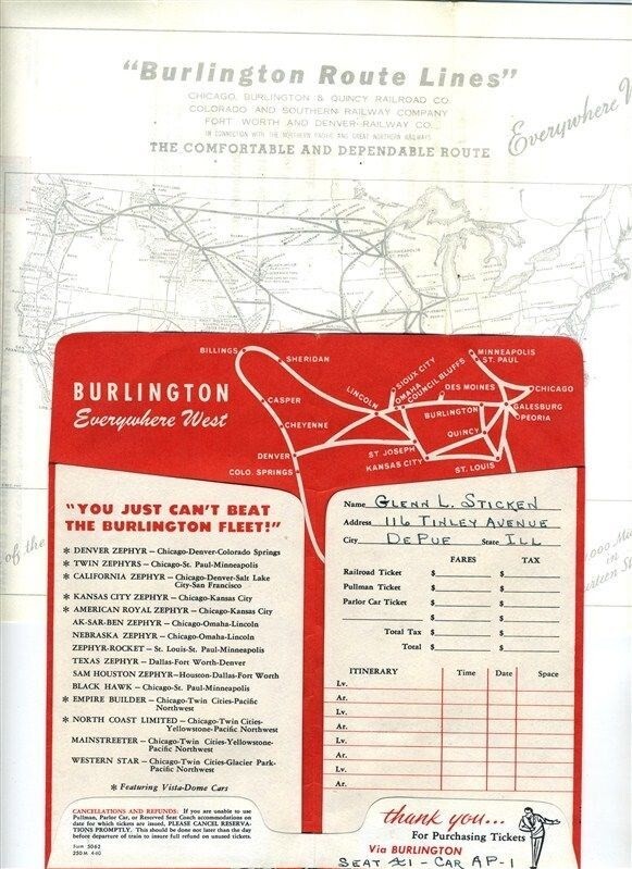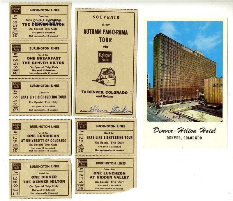 A large group of items from a 1963 Burlington Route Autumn Tour from Chicago to Denver in 1963. There are 2 Passenger Identification and Coach Reservation Coupons, A Burlington Route Ticket Jacket, 8 special use ticket coupons that are stamped on the back, An unused Denver Hilton Postcard and 2 letters. A receipt from the Denver Hilton Hotel One letter is written on stationary that has a route map on the back. And an envelope in which one of the letters was sent. All in fine condition. All items in the same name.