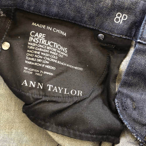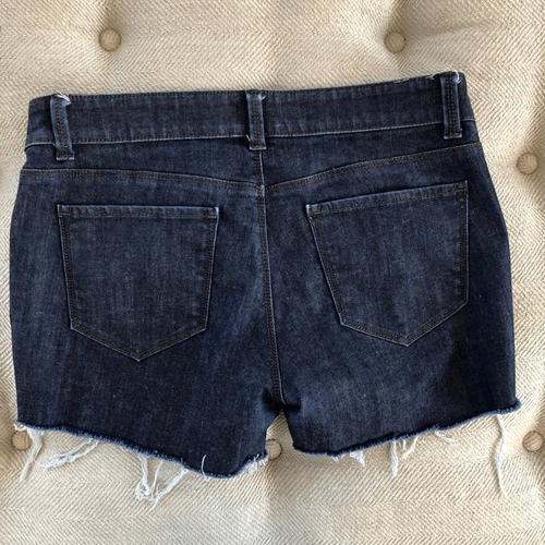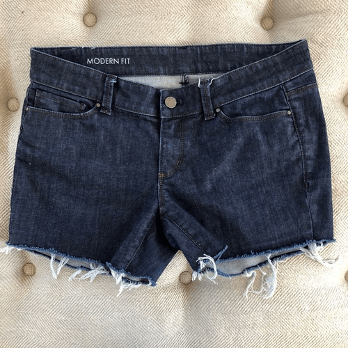 Ann Taylor modern fit dark wash denim jeans that have been cut down into cut off shorts. Zip fly. Laying flat measures approximately 16 inches straight across the waist with a 7.5 inch rise and 3.5 inch inseam.
