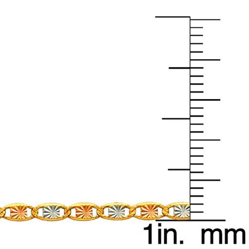 This exquisite Valentino chain with a star diamond-cut design necklace is a stunning piece crafted from genuine 14k tri-tone (yellow, white, and rose gold) gold, radiating elegance and sophistication. With its decorated flat oval links, this chain beautifully catches the light, making it a perfect addition to elevate your casual wardrobe. You can choose from five lengths?16, 18, 20, 22 or 24 inches ?allowing you to find the ideal fit for any occasion. The graceful 2.1-mm width of the chain adds a subtle touch of distinction, while the lobster claw clasp ensures secure wear, allowing you to wear it with confidence. Whether layered with other necklaces for a trendy look or worn solo to let its beauty shine, this necklace seamlessly complements any outfit. The gold weight varies slightly based on the selected length, with approximate weights of 16 inches: 2.18 grams, 18 inches: 2.4 grams, 20 inches: 2.65 grams, 22 inches: 2.87 grams, 24 inches: 2.97 grams. Each piece is meticulously crafted, and while all measurements are approximate, they reflect the dedication to quality in every necklace. This is not just a necklace; it is a statement of style that transcends age and gender, suitable for both men and women who appreciate timeless elegance. Treat yourself or a loved one to a classic accessory that exudes charm and sophistication, perfect for any occasion. Treat yourself or a loved one to a classic accessory that exudes charm and sophistication, perfect for any occasion. *This product is not suitable for children under 14*
