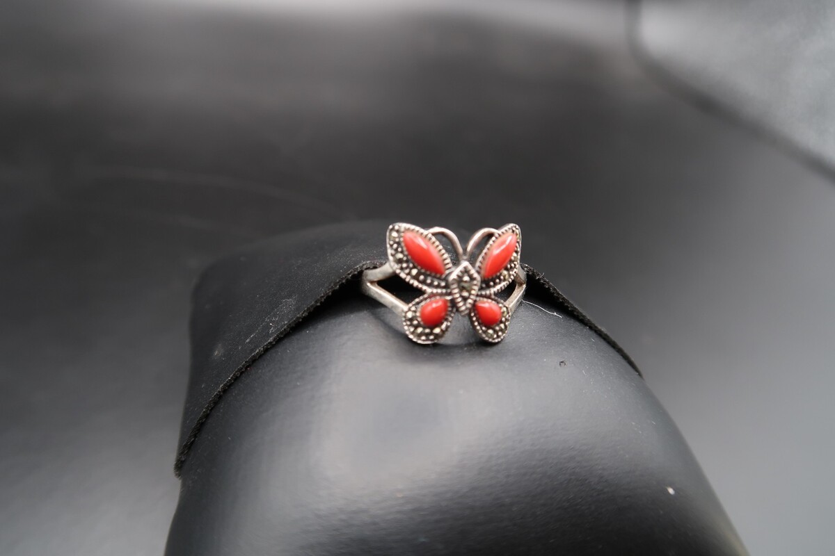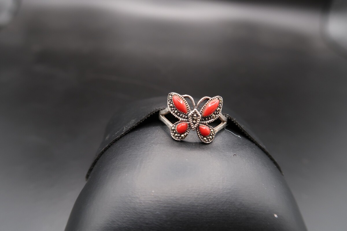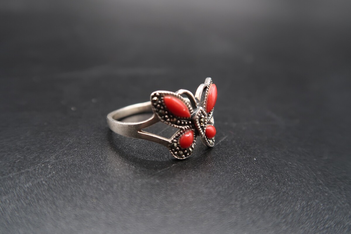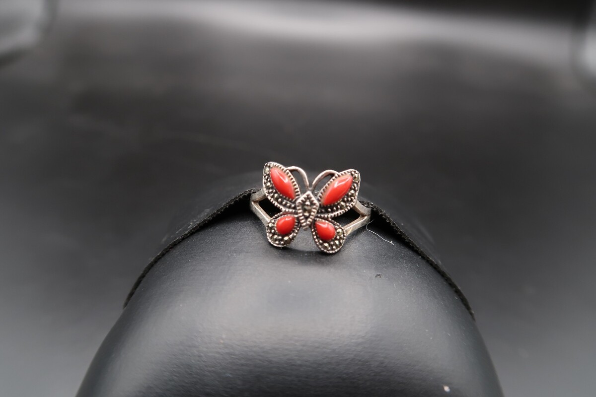 Vtg Sterling Silver 925 Southwestern Butterfly Ring W/ Red Coral Wings Size 9