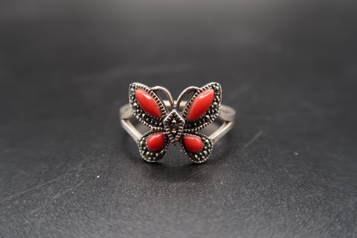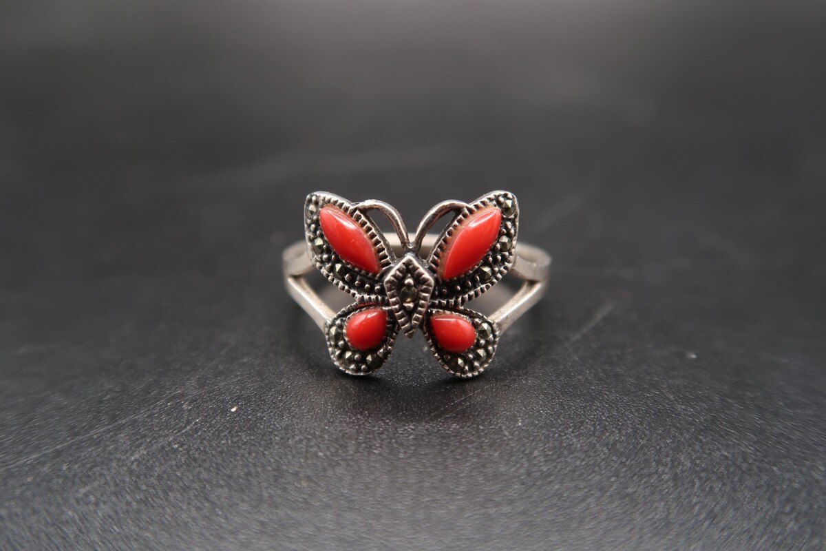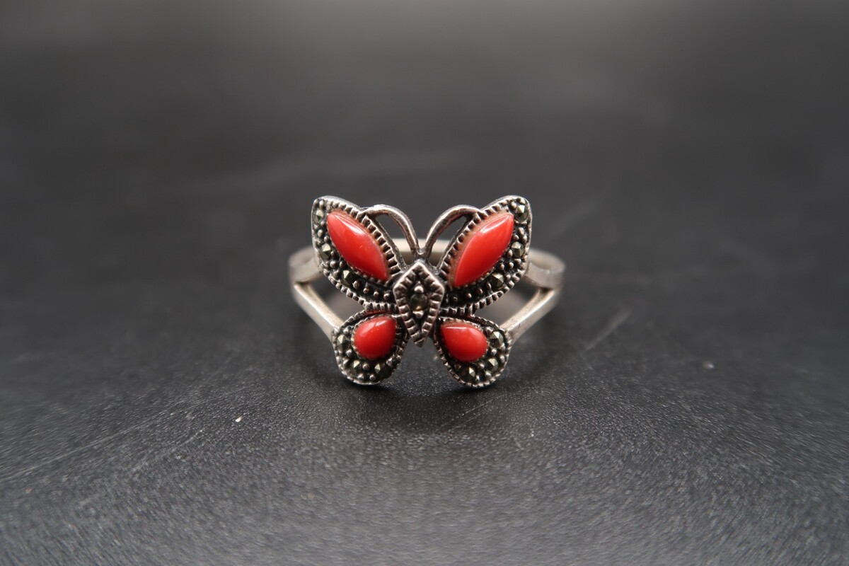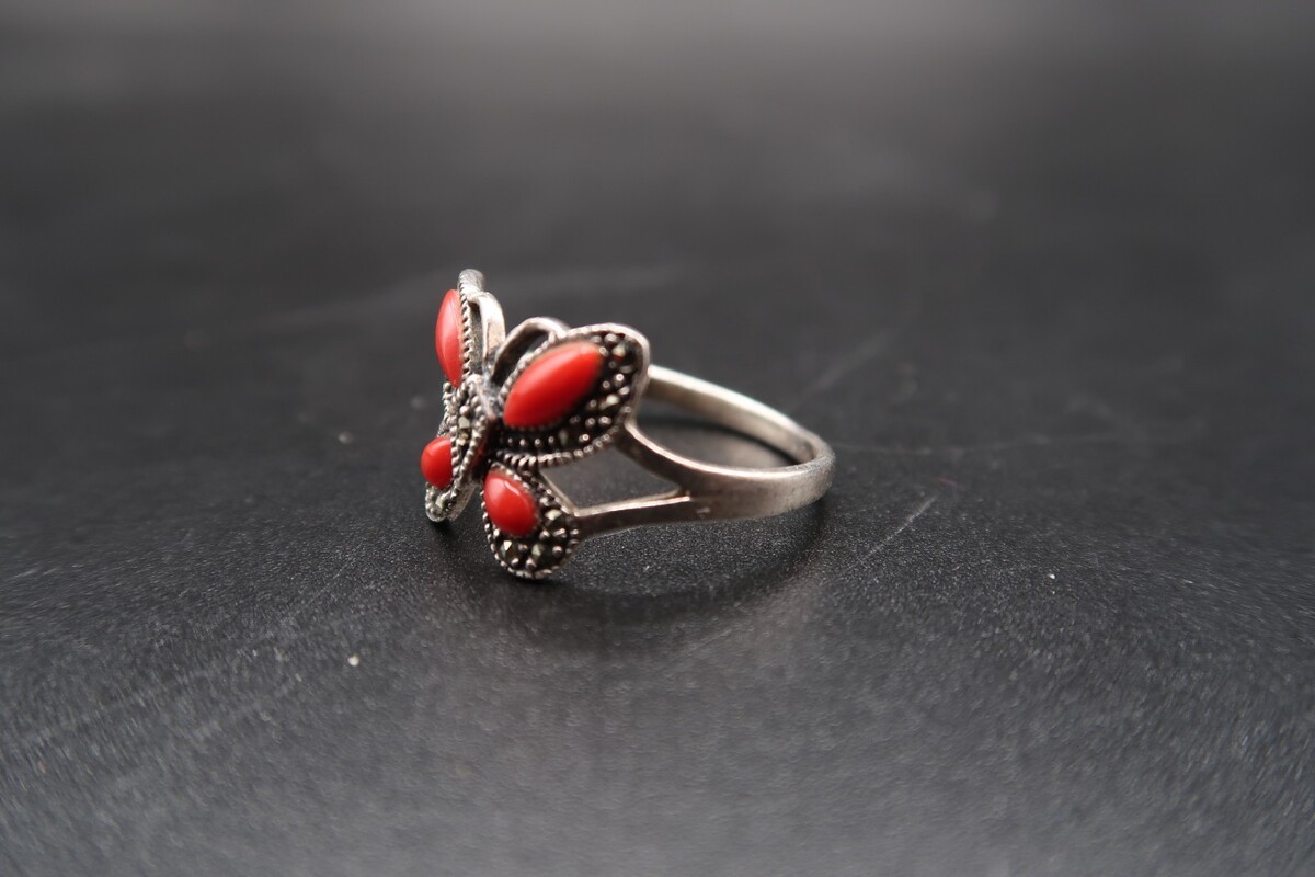 Vtg Sterling Silver 925 Southwestern Butterfly Ring W/ Red Coral Wings Size 9