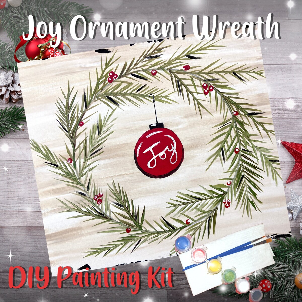 Joy Ornament Wreath Painting Kit - Paint Your Own - Hand-Drawn - Canvas Painting