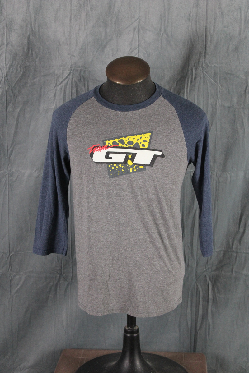Up for sale is a BMX shirt. It is a 3/4 sleeve with a grey body and blue sleeves. The front of the shirt has the classic GT logo screened on the chest. What a great shirt do not miss out on it.