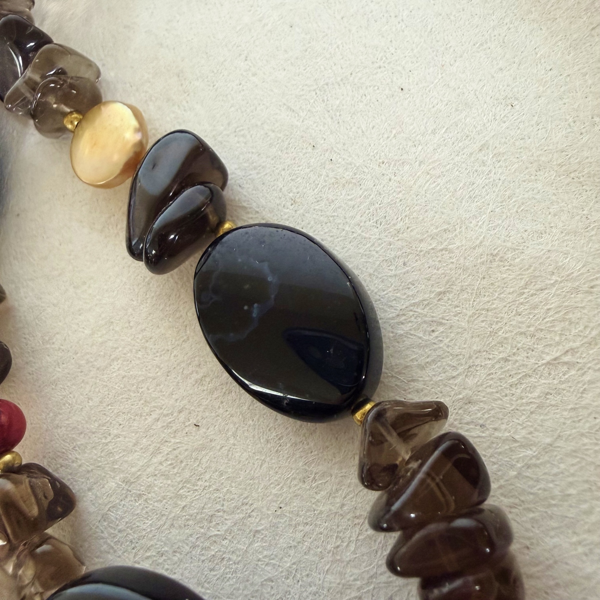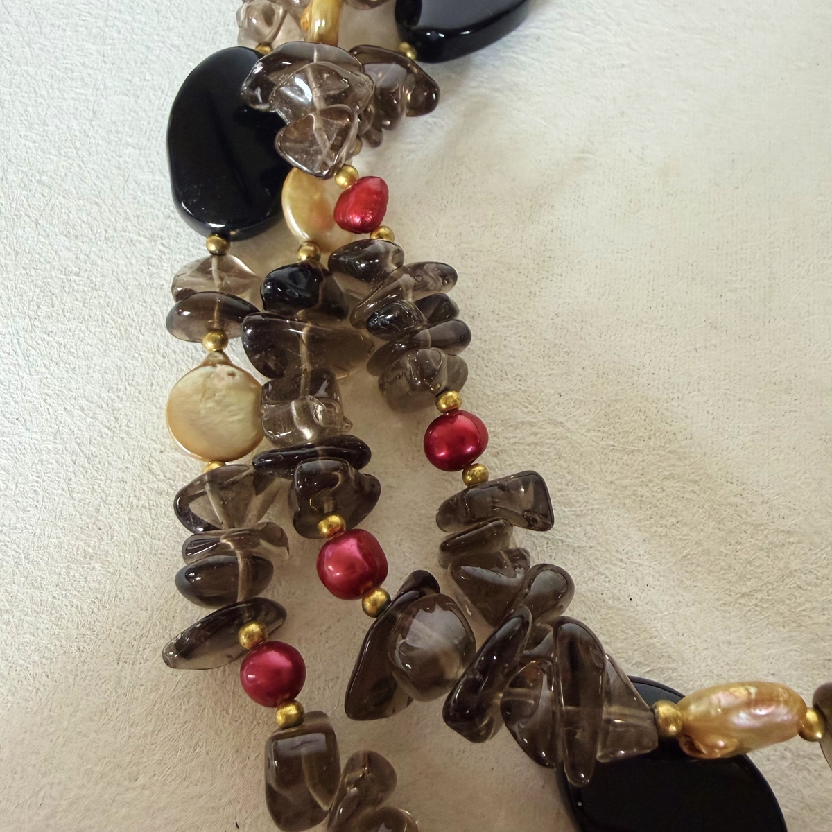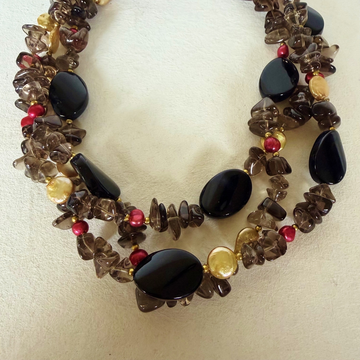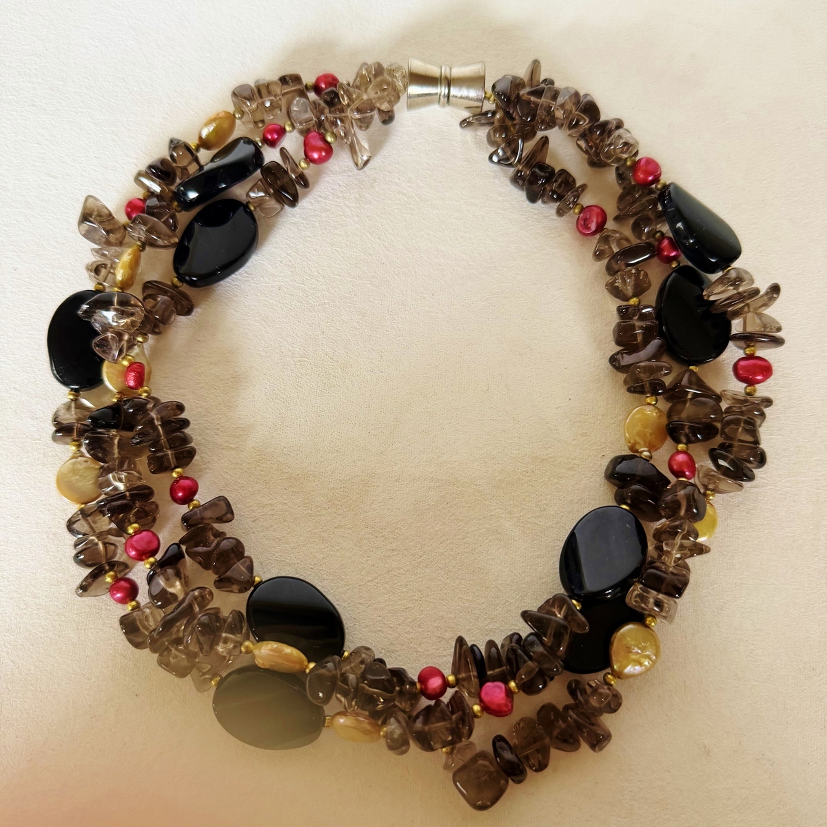 Smoke Brown Choker Necklace 3 Strand Statement Beaded Gold Red Magnet Close