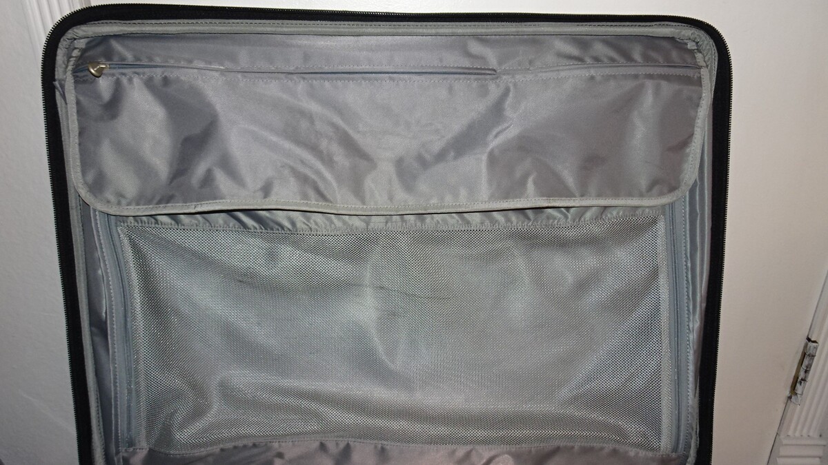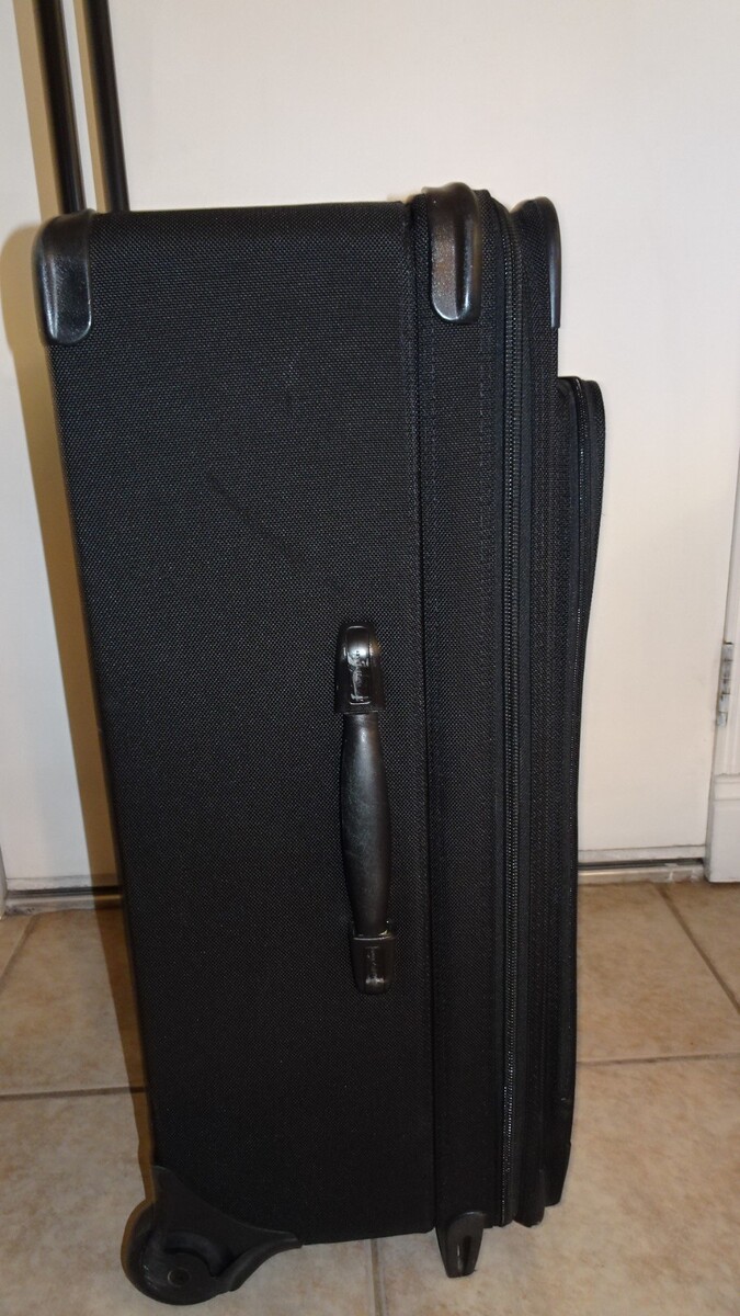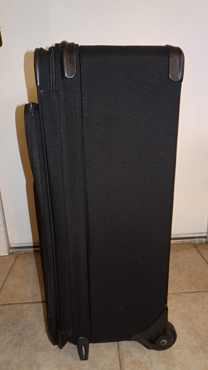 This suitcase has been lightly used and remains in excellent, like new condition. The exterior fabric is clean with minimal signs of use. The interior is very clean with no odors or stains. Wheels roll smoothly, telescoping handle extends and retracts properly, and all zippers function as intended.