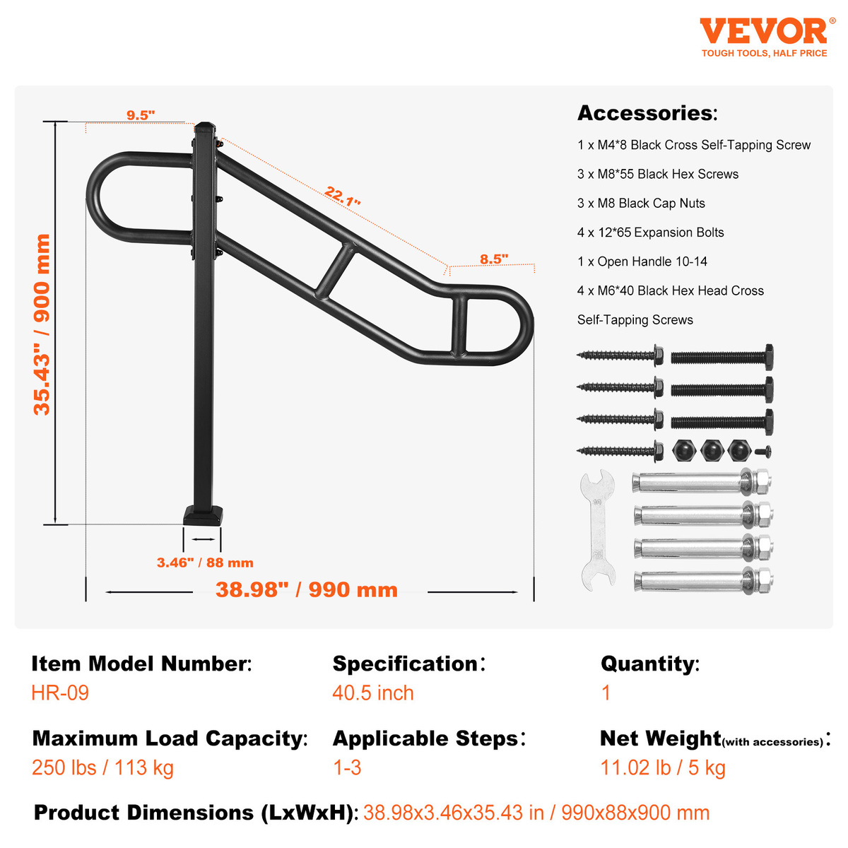 Suitable for 1-3 Steps: This 40.5" wall-mounted handrail is perfect for 1-3 steps, with a left handle length of 9.5", a right handle horizontal length of 8.5", and a slant length of 22.1". It is ideal for most garages, gardens, hallways, and more.