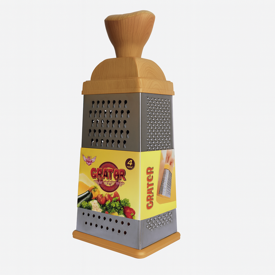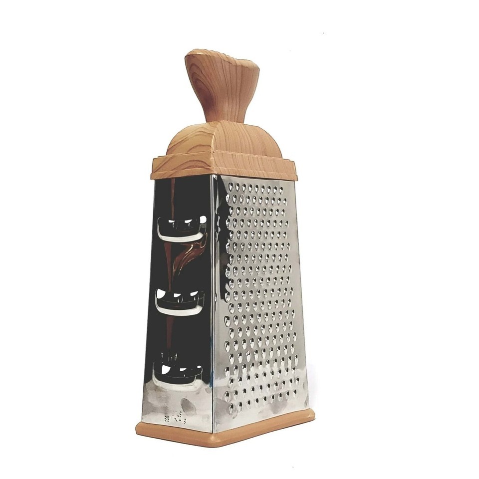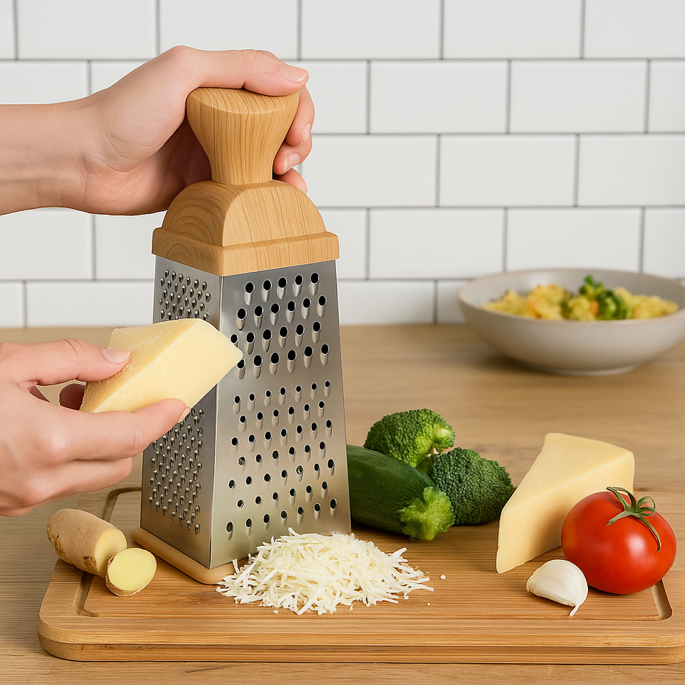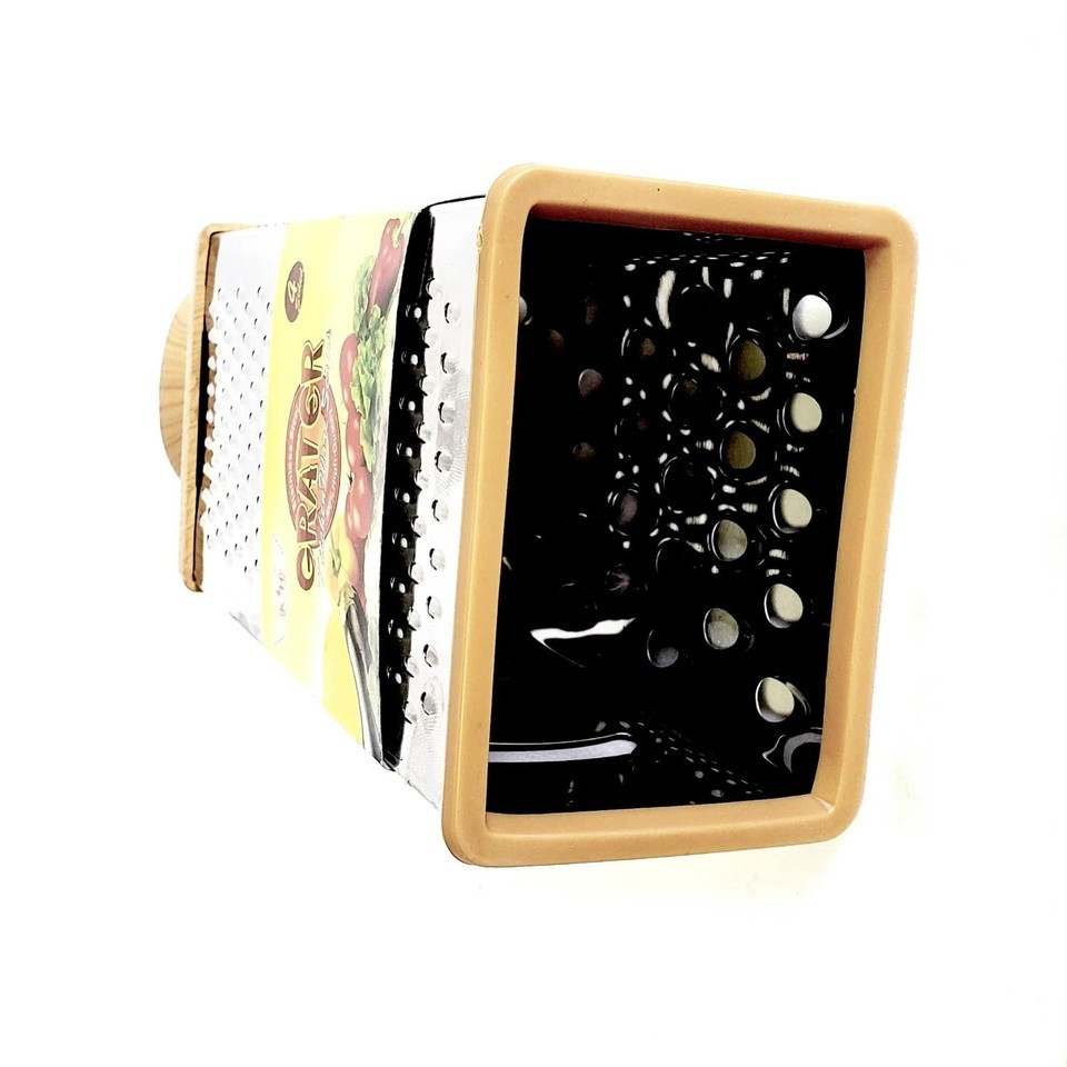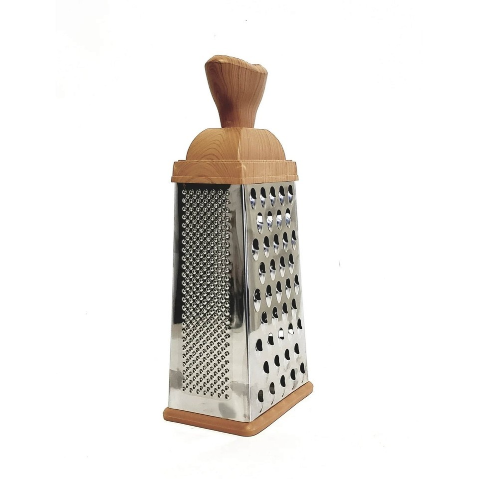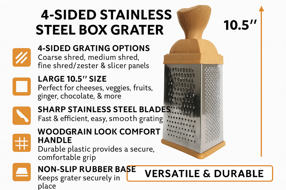 Upgrade your kitchen with this 10.5" 4-Sided Stainless Steel Box Grater ? a versatile, durable tool ideal for shredding cheese, vegetables, fruits, ginger, chocolate, and more. Designed with extra-sharp blades and a comfortable woodgrain-look handle, this grater delivers fast, effortless results for everyday cooking.