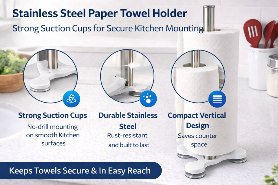 Keep paper towels secure and within reach with this countertop paper towel holder featuring a strong suction base. Designed for smooth, flat surfaces, the suction cup helps reduce sliding and tipping during everyday use.