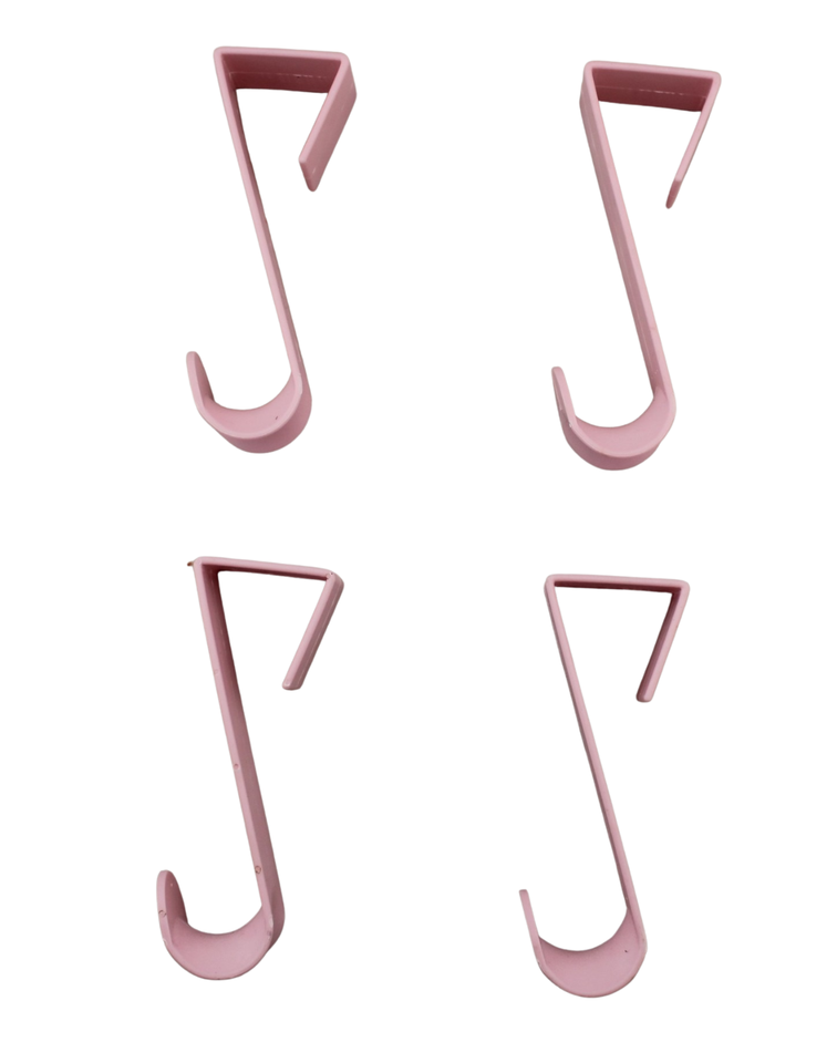 Organize any room instantly with this 4-Pack of Pink Over-The-Door Hooks. Each hook measures 4.5 inches and is made from smooth, durable plastic that won?t snag fabrics or scratch your door. Perfect for bedrooms, bathrooms, closets, dorm rooms, or even cabinet doors.