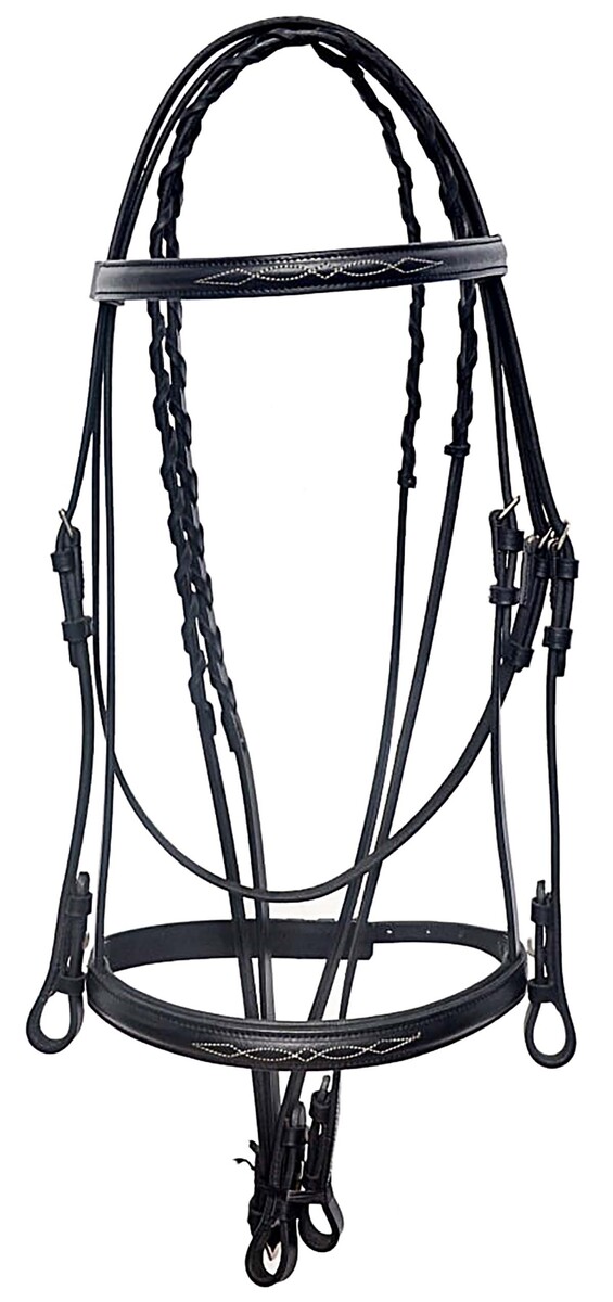 Challenger all-purpose English horse size bridle crafted from high-quality full-grain leather. Bridle comes accented with fancy stitch detailing. Perfect choice for training, showing, or everyday use. Soft leather padded noseband ensures comfort. Features rust-free stainless steel hardware, and comes double stitched throughout to ensure durability. Available in both traditional black or brown leather.
