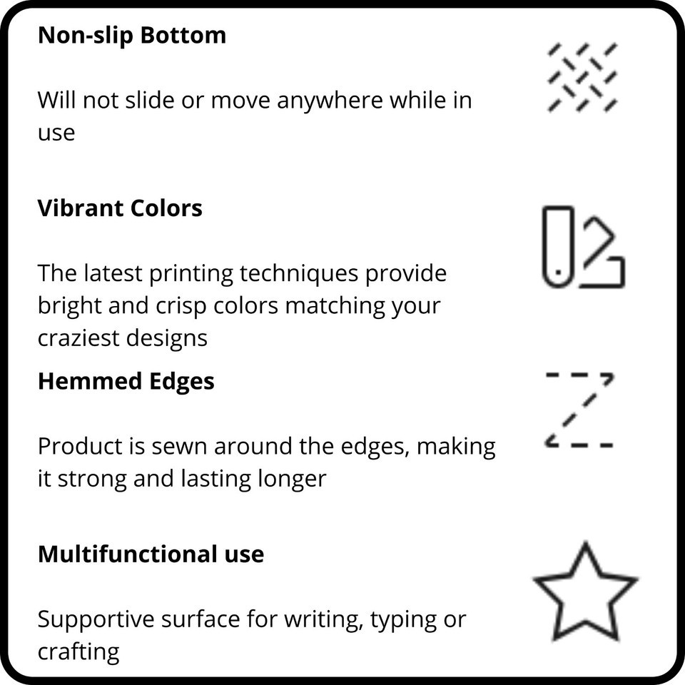 This desk mat is perfect for adding a personal touch to your work or home office. Made of 4mm thick neoprene, it has a non-slip backing and hemmed edge for durability and stability. Size 31" 15.5" and make your workspace shine.