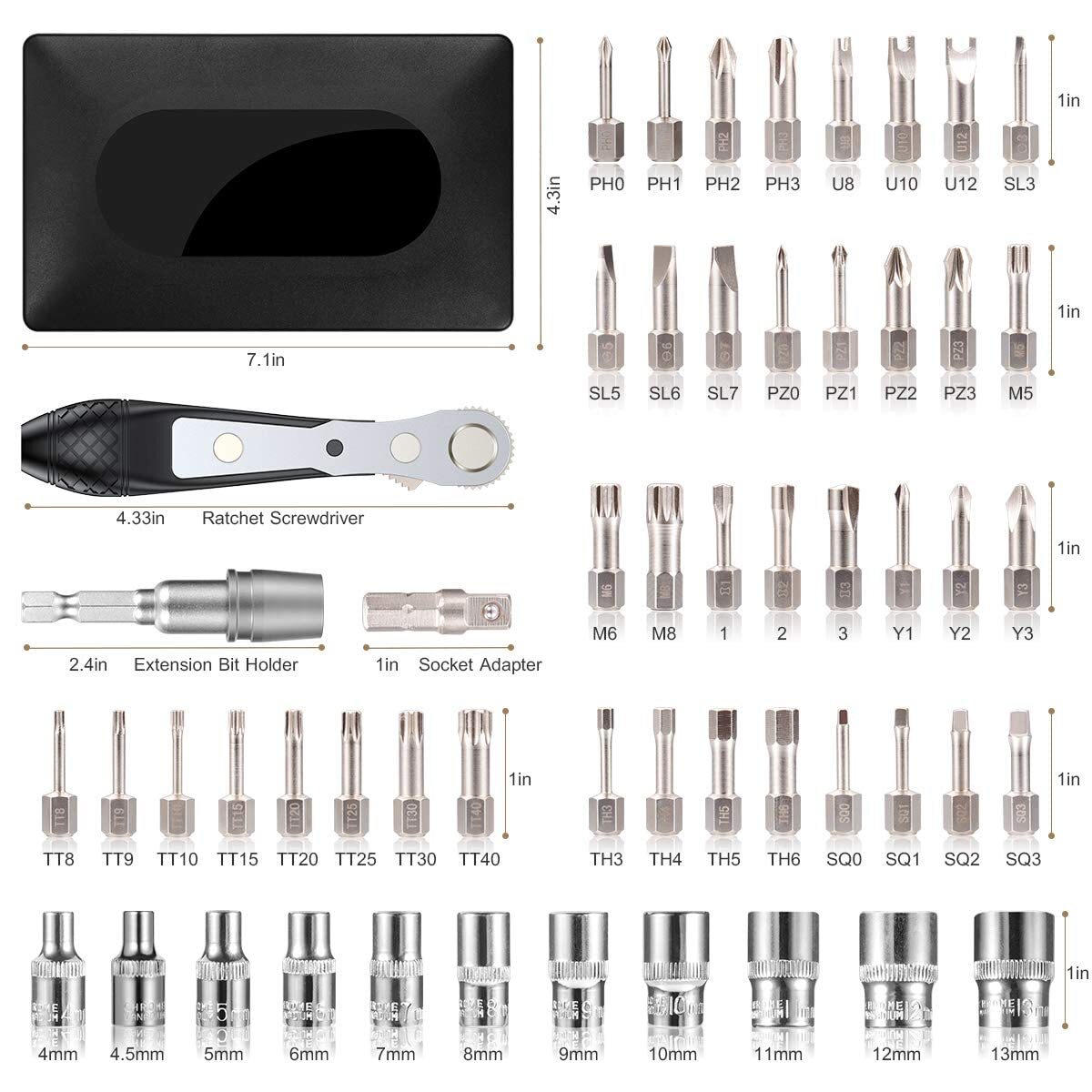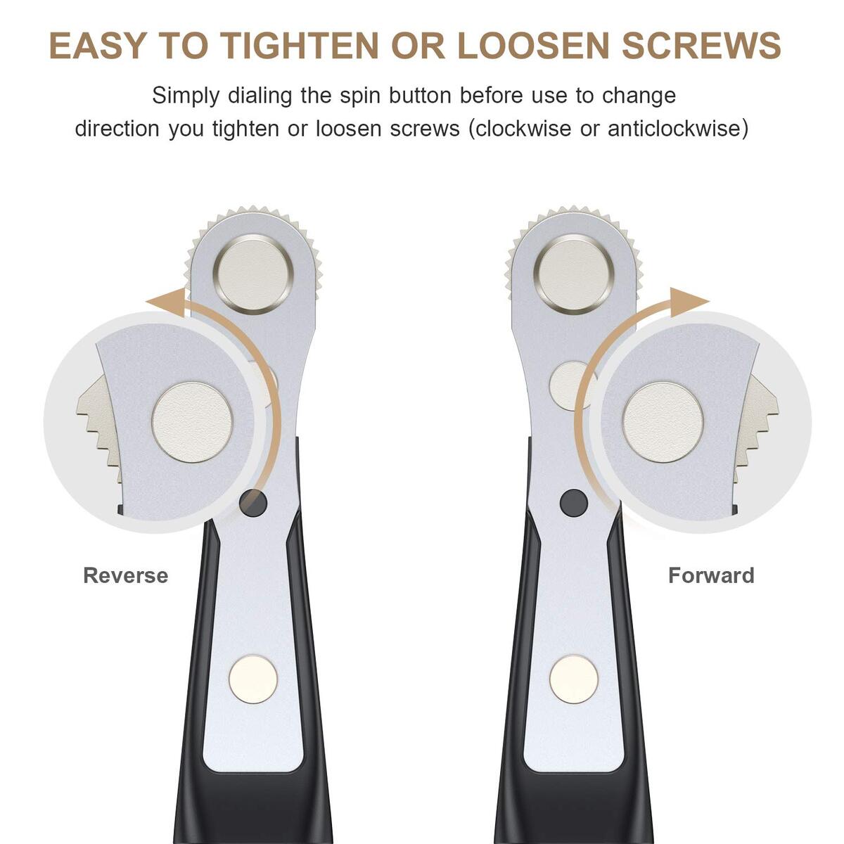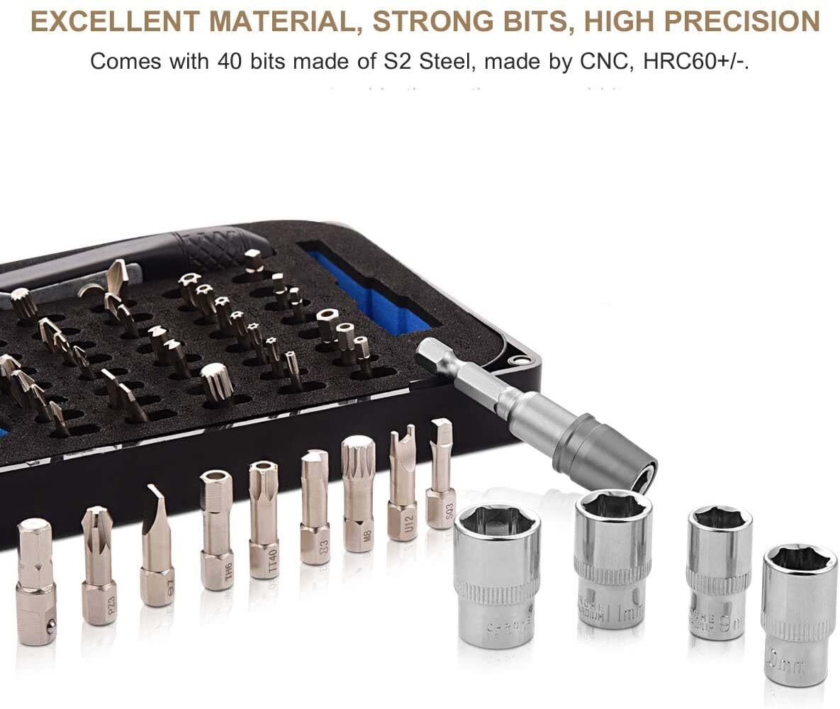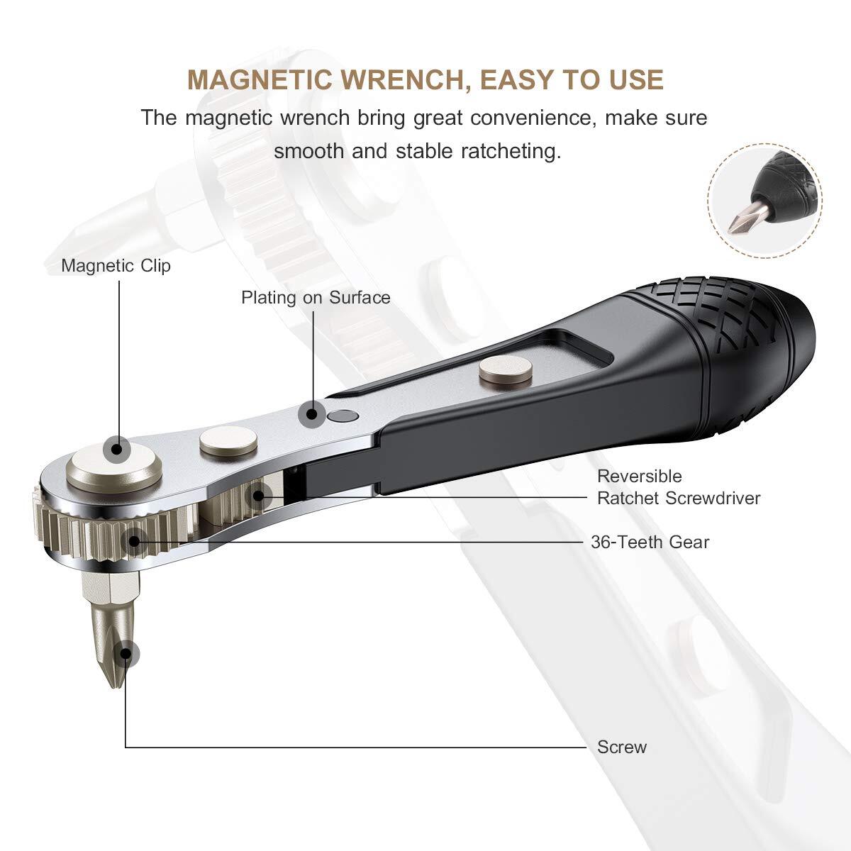 ? ?Perfect for Confined Space Operation?The mini ratchet wrench screwdriver is small and light enough for operation in confined places where the traditional screwdrivers might be too long to fit. Especially in awkward places like U shape corner, lateral surface, and other tight spaces. The comfortable non-slip grip provides excellent handling.,? ?High-Quality Ratcheting Screwdriver Wrench?The ratchet wrench (4.3" long) is powered with a 36-teeth reversible ratchet system to ensure smooth ratcheting in both directions. High-quality teeth provide high torque resistance and precise adjustment compared to 12-teeth or 16-teeth ratchet. Simply flip the spin button to change direction for tightening or loosening screws. Holders on the head and bottom of the wrench are strongly magnetized for holding the bits. No worries for bit drops.,? ?High-Quality S2 Steel Bits?The screwdriver bits are made of high-quality S2 steel, hardness reaching HRC60+/-. CNC machined and magnetized bits ensure precise fit, reducing wobbling.,? ?Wide-Range Bit Set?Phillips(PH0, 1, 2, 3), Spanner(U8, 10, 12), Slotted(SL3, 5, 6, 7), Pozidriv(PZ0, 1, 2, 3), Spline(M5, 6, 8), Clutch(1, 2, 3), Tri-point(Y1, 2, 3), Torx Security(TT8, 9, 10, 15, 20, 25, 30, 40), Hexagon Security(H3, 4, 5, 6), Square(SQ0, 1, 2, 3). 36-Tooth Ratchet Screwdriver, 1/4" Drive Socket (M4, 4.5, 5, 6, 7, 8, 9, 10, 11, 12, 13mm), ADP (1/4" Hex Shank to 1/4" Drive Socket Adapter), Quick Release Extension Bit Holder. Compatible with 1/4" socket, drill, etc.,? ?Wide Application?Suitable for domestic appliances, furniture, automotive, bicycle, industrial use, computers, electronics repair, hobbies, toys and crafts, DIY home improvement project, etc. Bits also fit for any 1/4" hex shank screwdriver or extension bit holder for power tools, impact driver.