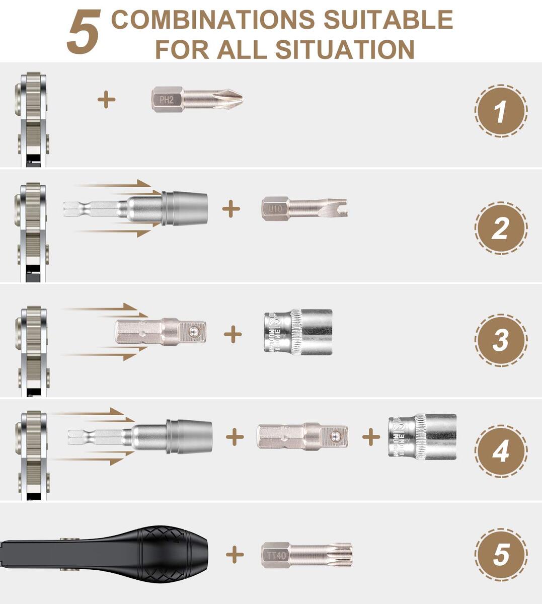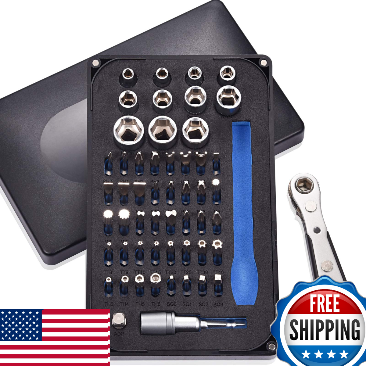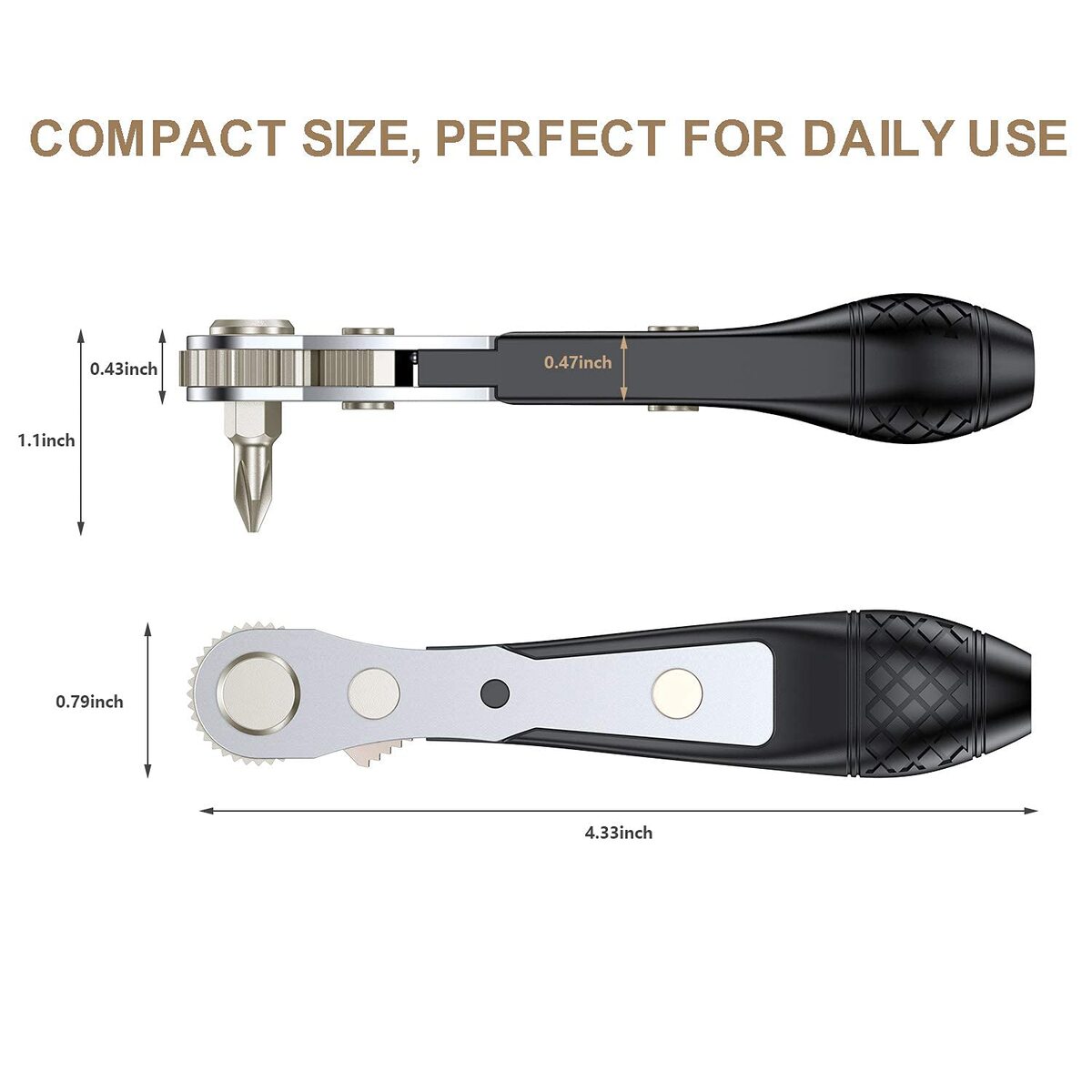 ? ?Perfect for Confined Space Operation?The mini ratchet wrench screwdriver is small and light enough for operation in confined places where the traditional screwdrivers might be too long to fit. Especially in awkward places like U shape corner, lateral surface, and other tight spaces. The comfortable non-slip grip provides excellent handling.,? ?High-Quality Ratcheting Screwdriver Wrench?The ratchet wrench (4.3" long) is powered with a 36-teeth reversible ratchet system to ensure smooth ratcheting in both directions. High-quality teeth provide high torque resistance and precise adjustment compared to 12-teeth or 16-teeth ratchet. Simply flip the spin button to change direction for tightening or loosening screws. Holders on the head and bottom of the wrench are strongly magnetized for holding the bits. No worries for bit drops.,? ?High-Quality S2 Steel Bits?The screwdriver bits are made of high-quality S2 steel, hardness reaching HRC60+/-. CNC machined and magnetized bits ensure precise fit, reducing wobbling.,? ?Wide-Range Bit Set?Phillips(PH0, 1, 2, 3), Spanner(U8, 10, 12), Slotted(SL3, 5, 6, 7), Pozidriv(PZ0, 1, 2, 3), Spline(M5, 6, 8), Clutch(1, 2, 3), Tri-point(Y1, 2, 3), Torx Security(TT8, 9, 10, 15, 20, 25, 30, 40), Hexagon Security(H3, 4, 5, 6), Square(SQ0, 1, 2, 3). 36-Tooth Ratchet Screwdriver, 1/4" Drive Socket (M4, 4.5, 5, 6, 7, 8, 9, 10, 11, 12, 13mm), ADP (1/4" Hex Shank to 1/4" Drive Socket Adapter), Quick Release Extension Bit Holder. Compatible with 1/4" socket, drill, etc.,? ?Wide Application?Suitable for domestic appliances, furniture, automotive, bicycle, industrial use, computers, electronics repair, hobbies, toys and crafts, DIY home improvement project, etc. Bits also fit for any 1/4" hex shank screwdriver or extension bit holder for power tools, impact driver.