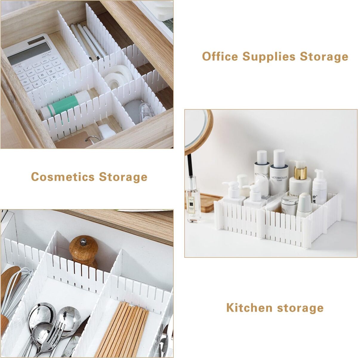 Versatile: Plastic drawer dividers are suitable for offices, kitchen, bedroom, bathroom, recreational vehicle etc., and can be used as dividers on drawers, dressers, boxes,tables and closets to store your clothes, socks, underwear, cosmetics, lipstick, spice, and more.,Easy installation: Adjustable drawer dividers can be adjusted to accommodate different drawer sizes. Before use, you can cut the partition according to your own needs. Then simply align the card slots to separate the drawers.,MANY OCCASIONS: Your can use it as a separator for drawer, dresser, box container, desk and closet to storage your clothes, underwear, socks, underwear, makeup, lipstick, babies cardboard, and so on. Nowadays, it is widely used in kitchen, bedroom, bathroom and office.,Easy maintenance: Drawer divider extenders are easy to clean and maintain. It can be wiped clean with a damp rag or rinsed with running water. Then wipe the drawer divider clean with a dry rag and it's ready to use.,Keep your drawers clean: Pack of 32 Drawer dividers give every little thing you have a place for, allowing you to find what you need at a glance and say goodbye to the hassle of looking around.