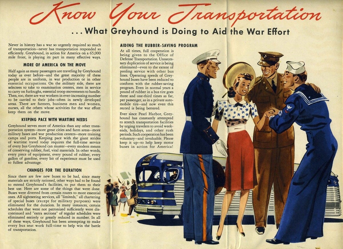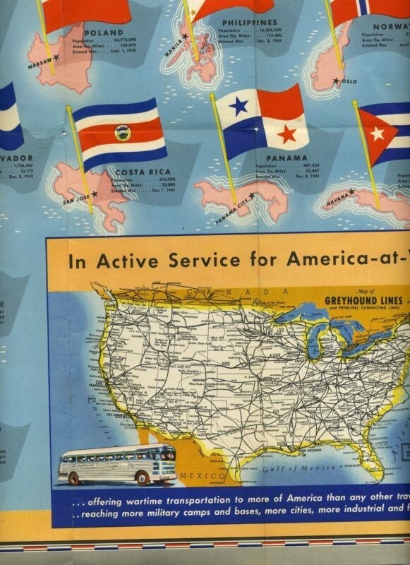 Opens to about 23 1/2" x 18" and is in very good condition. On one side is a United States map showing Greyhound Lines routes and Flags and information on Members of the United Nations. On the other side is information on What Greyhound is doing to Aid the War Effort and colorful charts of insignia of rank for officers and enlisted men, branch of service insignia, for the Army, Navy and Marine Corp as well as decorations and much more.