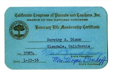 A 1956 California Congress of Parent and Teachers Inc. , Honorary Life Membership Certificate. In very good condition with a crease, measures about 4" x 2 1/2". This status was achieved by making a donation to the organization. The funds donated were used for scholarships, loans and grants to students.