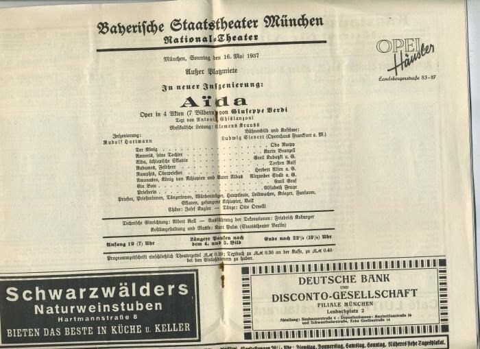 Bayerische Staatstheater Munchen, Program in German from a performance of AIDA on May 16, 1937. A 28 page soft cover program filled with photos, ads, theatre and performer information and more. In very good condition.