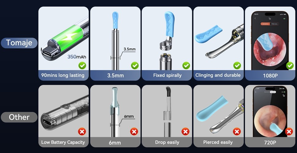Our ear wax remover with camera features a low-heating chip, which keeps temperature of the handle and lens close to the human body temperature.