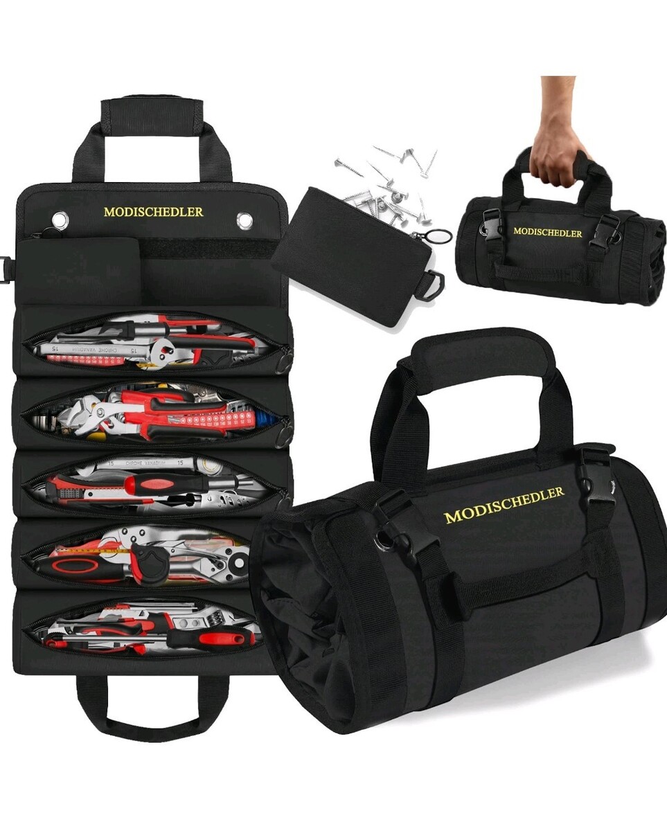 The Modischedler Tool Roll Bag is a versatile and portable storage solution for tools and accessories. With 5 expanded compartments and 12 compartments in total, including 2 removable bags, this tool bag provides ample storage space for various tools. Made from durable fabric with PVC coating, it is lightweight at 1.12 pounds and compact with dimensions of 13.46x5.67x2.8 inches. The black color and sleek design make it a practical and stylish addition to any workshop or tool collection. Ideal for professionals or DIY enthusiasts, this tool roll bag offers convenience and organization on the go.