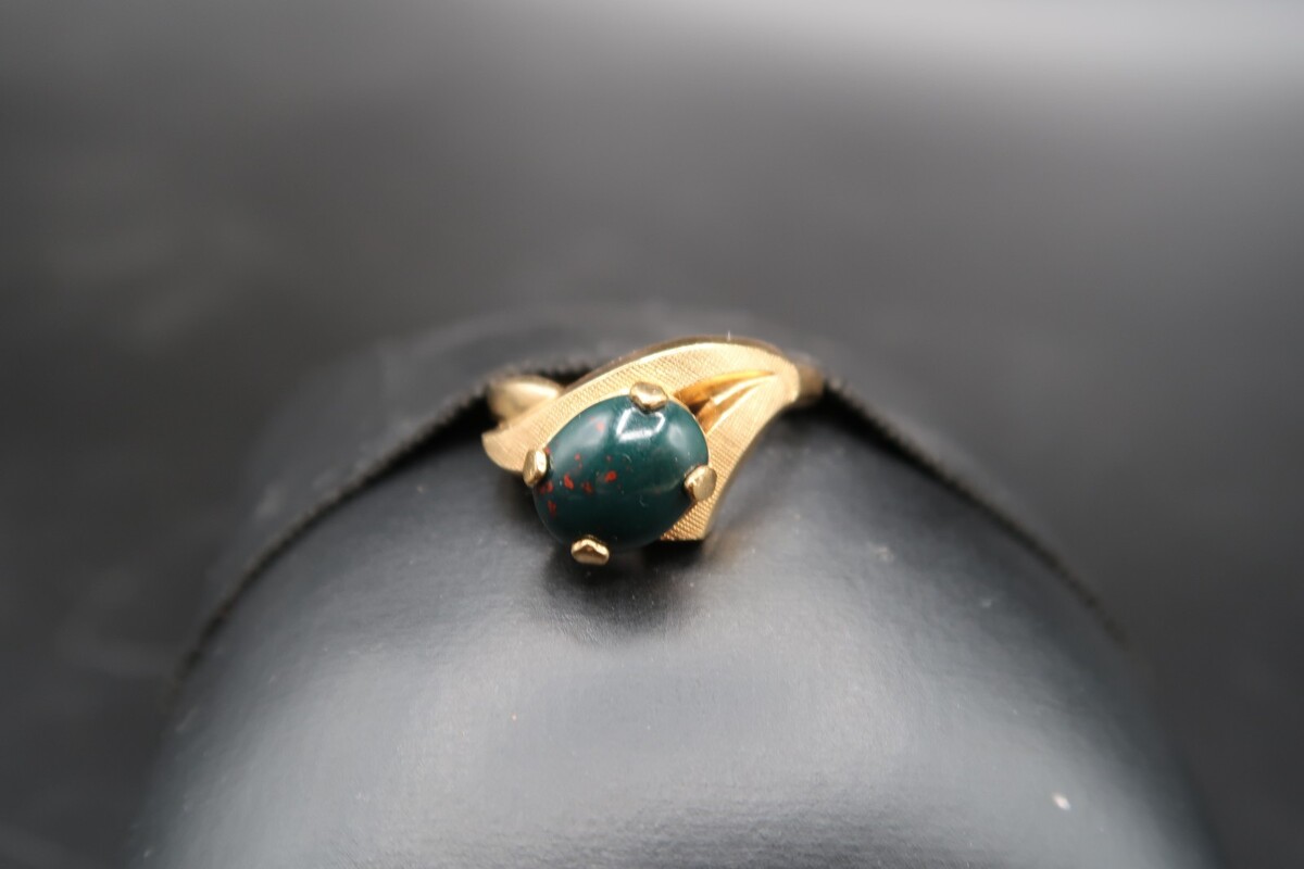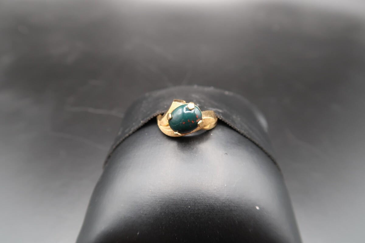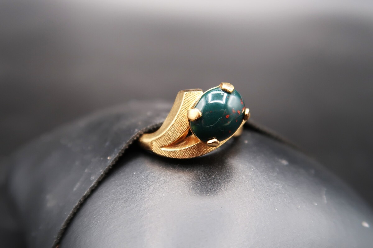 Vtg 10KT Gold Fill Ring w/ Oval Green Bloodstone Cabachon Adjustable Signed Rare