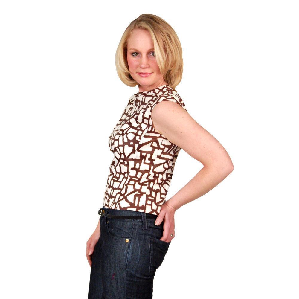 Vintage 1960s sleeveless blouse, size M (bust 38?, waist 32?), in a chic brown and white abstract print. Designed with a jeweled neckline for sparkle, a full back zipper, and fully lined in acetate. A simple yet striking piece with mid-century flair.