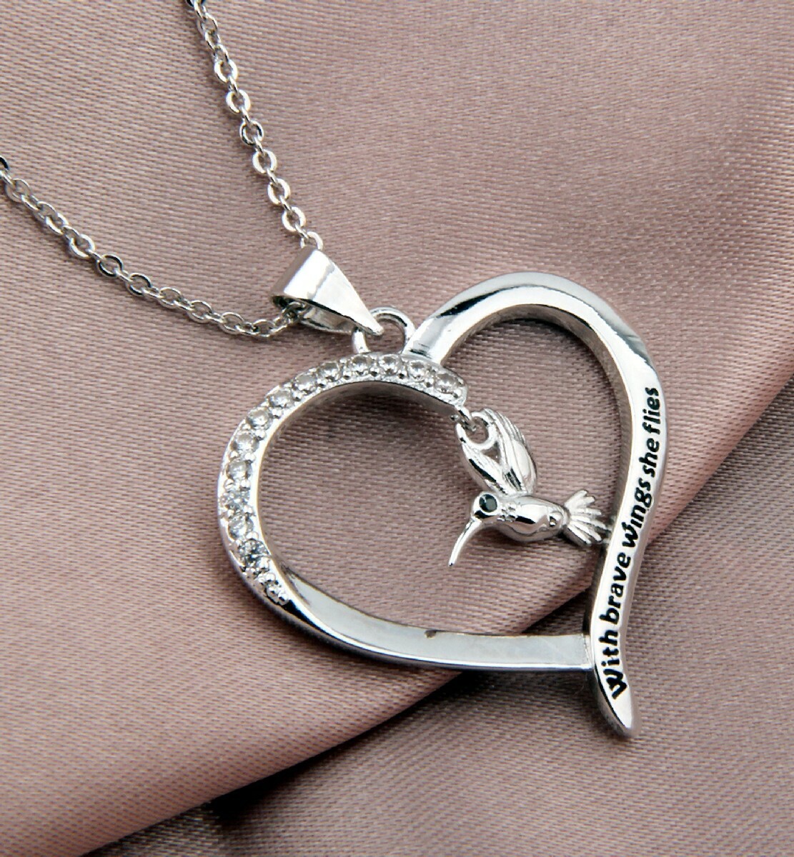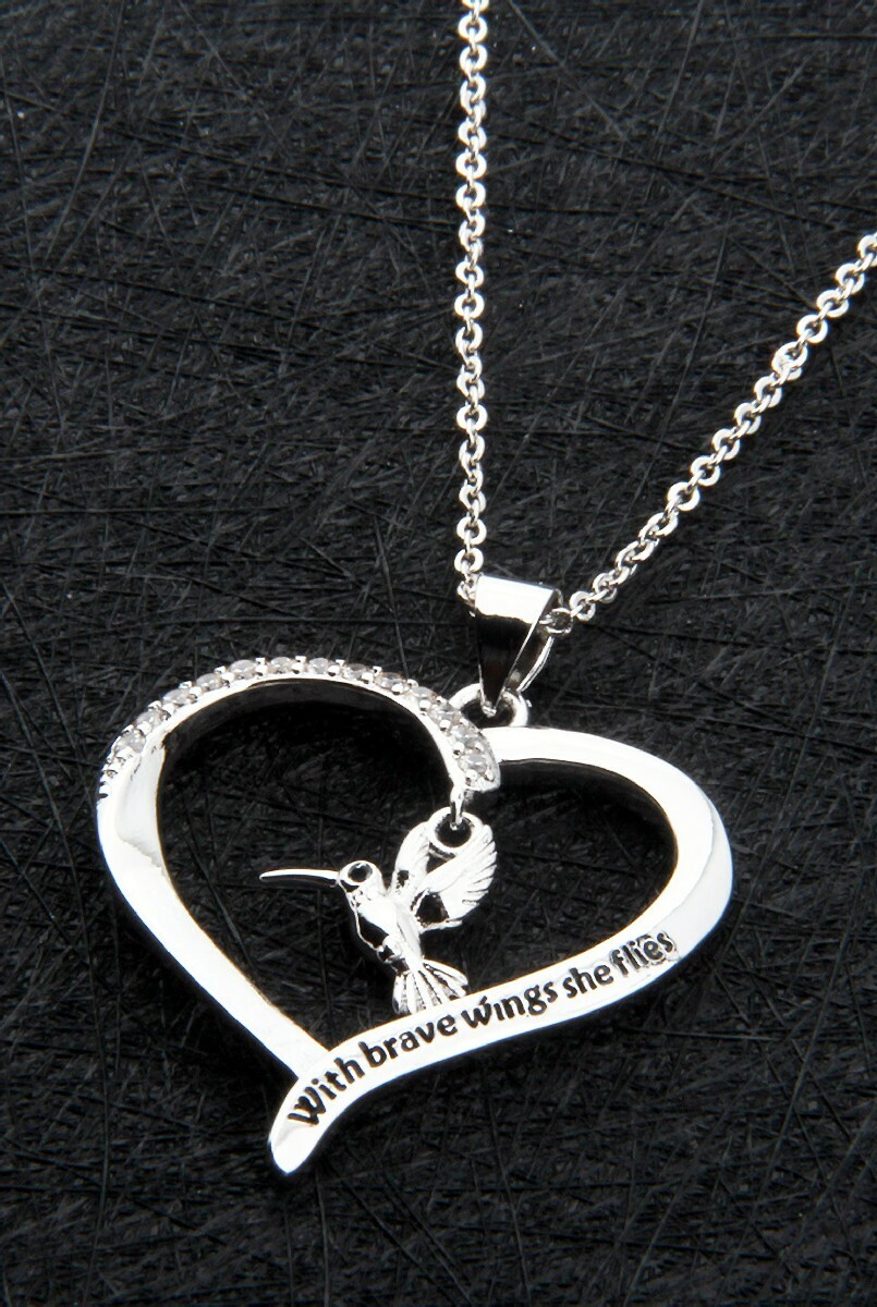 Elegante collar de colibrí con alas valientes, vuela joyas inspiradoras joyas de colibrí. Esta pieza de collar tiene plata en color y en forma de corazon, grabada con su mensaje: "Con valientes alas, ella vuela" Todo hecho con una cadena de plata de 18 pulgadas. Una hermosa creacion.