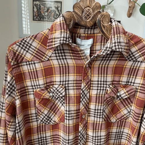 Wrangler 100% cotton flannel western style, paralyzed, snap closure, shirt, rusty, orange and brown plaid flap snap chest pockets. Western style stitching at the pockets and across the yoke. Laying flat measures 26 inches shoulder to hem and 24 inches armpit 2 armpit