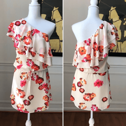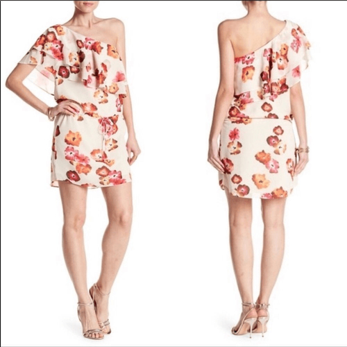 Nordstrom?s Haute Hippie One Shoulder Floral Print Ruffle Dress NWT Size: L Color: Cream base with flowers in pink, red, and orange shades Brand Name of Color: ? Tie Dye Floral? Floral print one shoulder dress with draping ruffled layers across top hem of dress. All over floral print and a waist tie with front popover details. Fabric Content: 100% Polyester.
