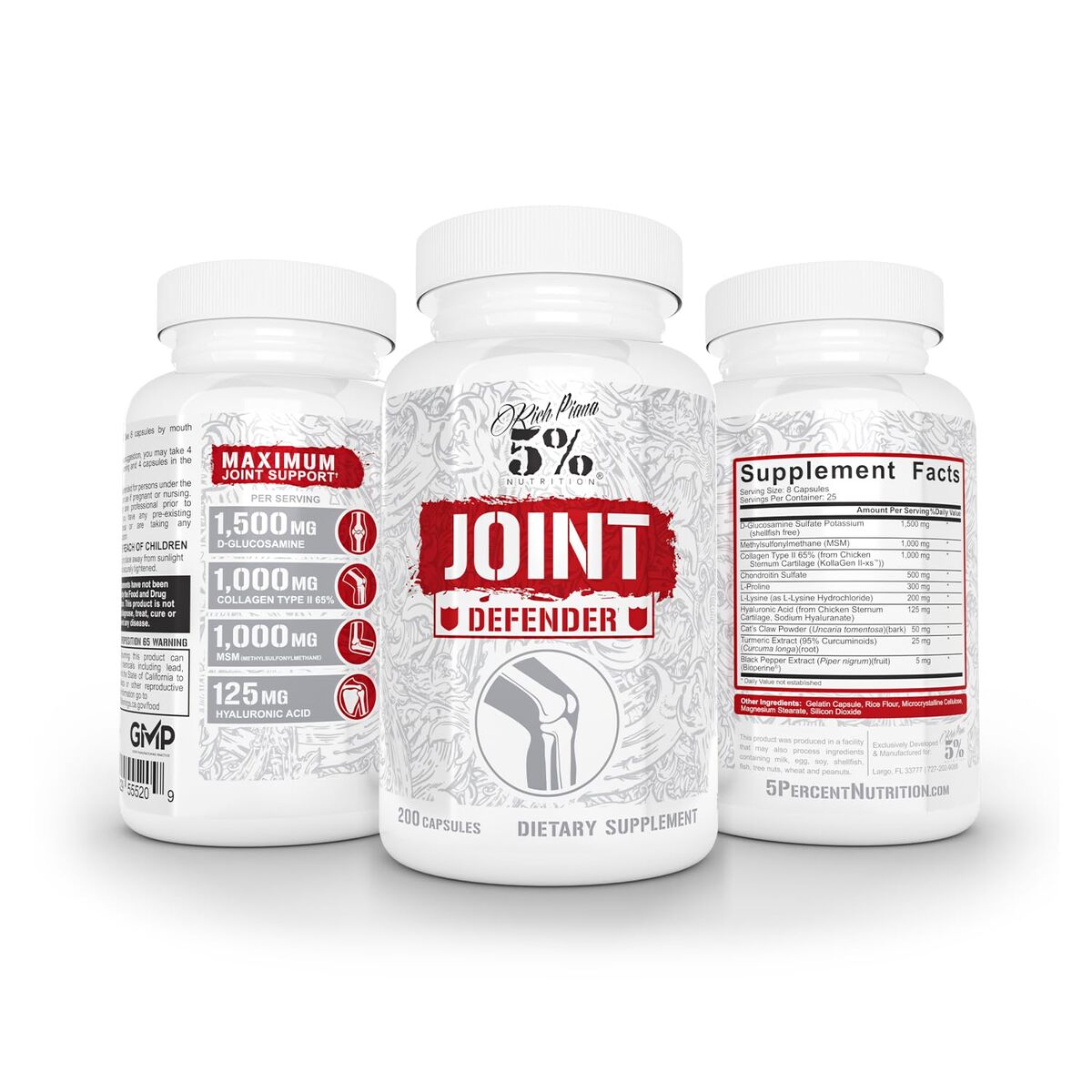 HARDCORE JOINT SUPPORT FOR HARDCORE TRAINING: Get the relief you need for your sanity and long-term goals! Joint Defender supports joint health and mobility.,GLUCOSAMINE, CHONDROITIN, MSM, TYPE 2 COLLAGEN and hyaluronic acid, a component of synovial fluid that lubricates the joints, together promote joint and cartilage health. In addition, this complete supplement provides aid to all of the body's connective tissues.,ANTIOXIDANT POWER with the Post-Exercise Complex, featuring Dimagnesium Malate, Boswellia, Ginger Extract and Curcumin. Bodybuilding and sports keep you fit, but come with deterioration issues. Be proactive against wear and tear now so you can keep performing later!,PROTECT YOUR MUSCLES, TISSUES CELLS: The body is complex but made of a few key components, connective tissue being one of them. Muscles, tendons, ligaments and virtually all somatic cells benefit from supplements that promote elasticity.,5% NUTRITION DELIVERS the industry's highest quality supplements, with comprehensive formulations that help you achieve elite level performance. All supplements are produced in certified GMP facilities and third party tested.