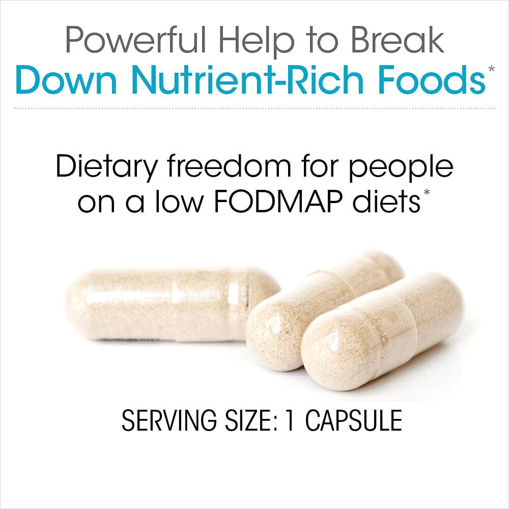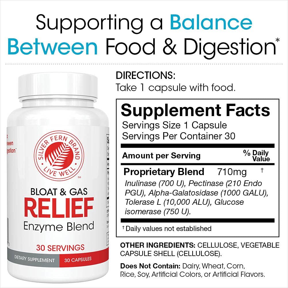 BLOAT GAS RELIEF - Each Bottle = 30 Capsules = 30 Servings - Supports digestion of fermentable oligosaccharides, disaccharides, and monosaccharides* Promotes reduction of bloating and gas* - Helps relieve digestive issues without the need for food avoidance* - Helps deal with discomfort caused by nutrient dense foods, vegetables, and fruits*,INULINASE - may reduce microbial fermentation and gas production associated with inulin intake. Inulin can be found in a variety of fruits, vegetables, and grains, including onions, bananas, garlic, and artichokes.* -- ALPHA-GALACTOSIDASE - can help improve digestion of certain prebiotics derived from legumes and helps with digestion of beans, peas, cabbage, whole grains, broccoli, and other vegetables.*,PECTINASE - helps break down pectin into simple sugars and galacturonic acid that are easier to absorb. Pectin can be found in fruits and vegetables, including apples, peaches, raspberries, apricots, sweet potatoes, carrots, and tomatoes.*,TOLERASE L - helps break down lactose into simple sugars, glucose, and galactose. Taking Tolerase L alongside lactose-containing foods can help reduce hydrogen production in the intestines and helps reduce discomforts such as bloating, gas, diarrhea, and abdominal cramps.*,GLUCOSE ISOMERASE - helps improve fructose absorption by converting fructose into the more easily absorbed glucose. High-fructose corn syrup has caused a surge in Fructose malabsorption, which can cause hydrogen production, nausea, and abdominal pain. Fructose is also found naturally in many fruits and vegetables.* - * These statements have not been evaluated by the Food and Drug Administration. This product is not intended to diagnose, treat, cure or prevent any disease.