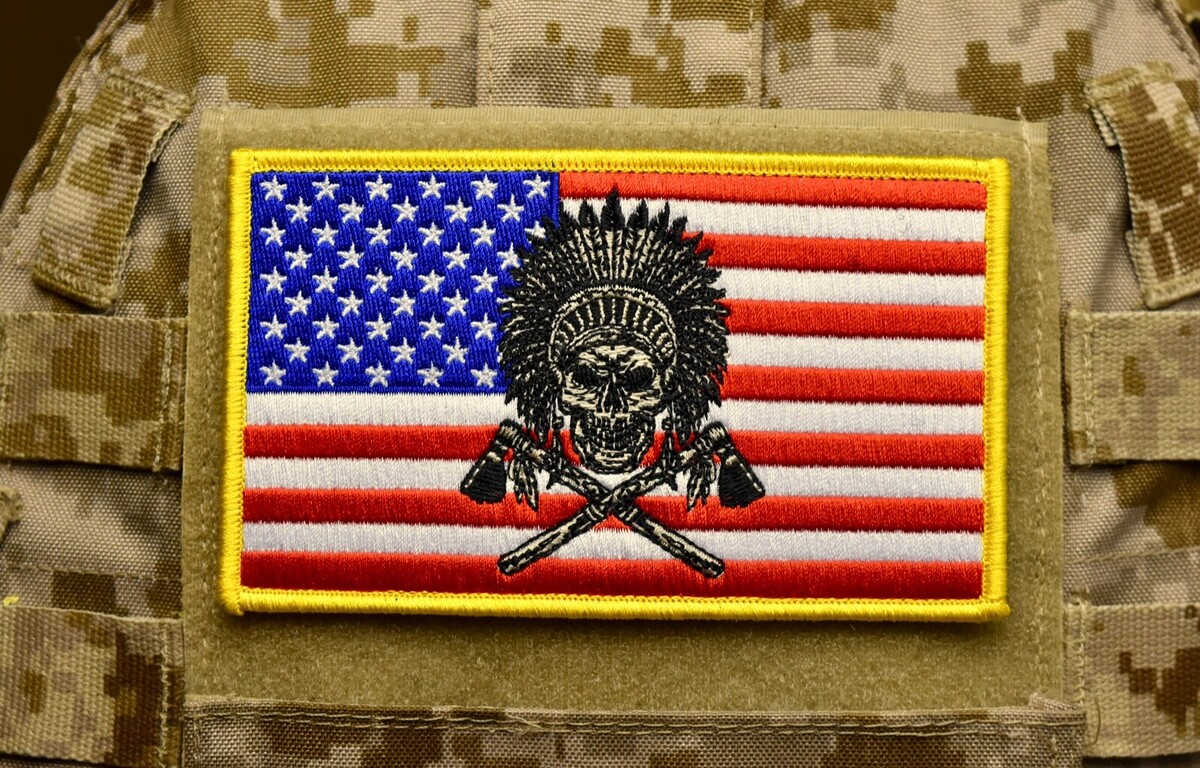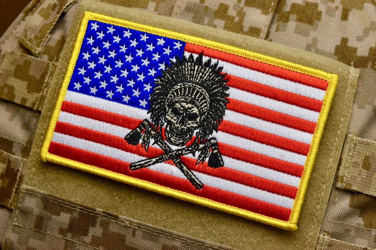 Embroidered large US flag with embroidered Indian Chief design. Measures 3" x 5" with VELCRO Brand hook fastener backing.