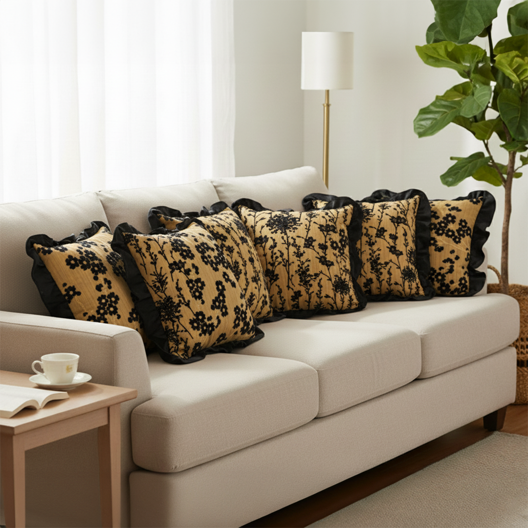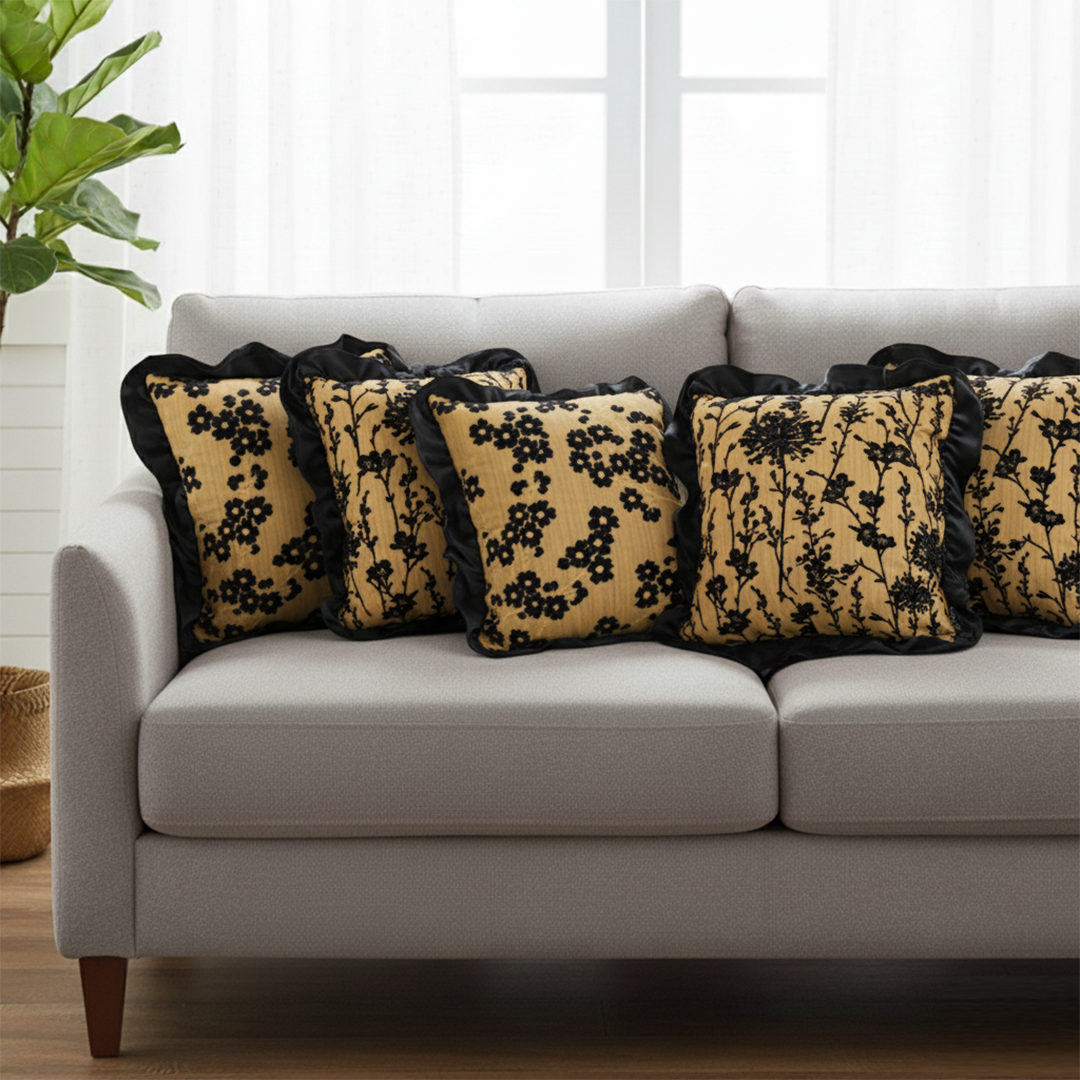 SOGA 6PC Black & Gold Floral Velvet & Mustard Gold Ruffle Pillowcase Set – 45cm