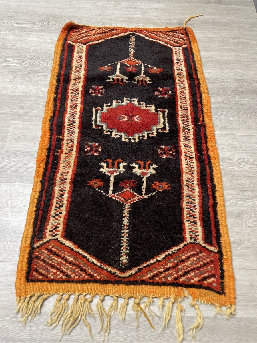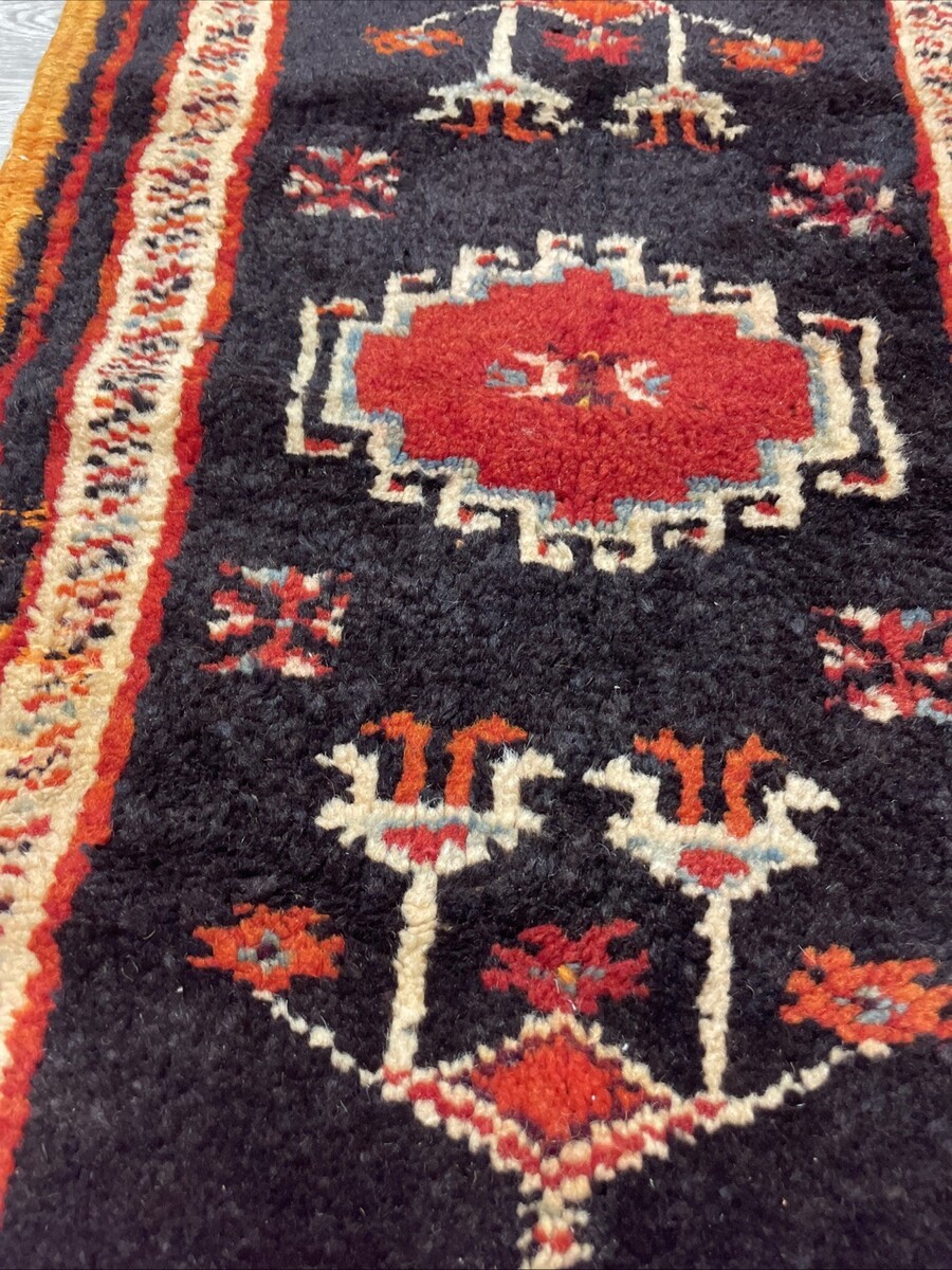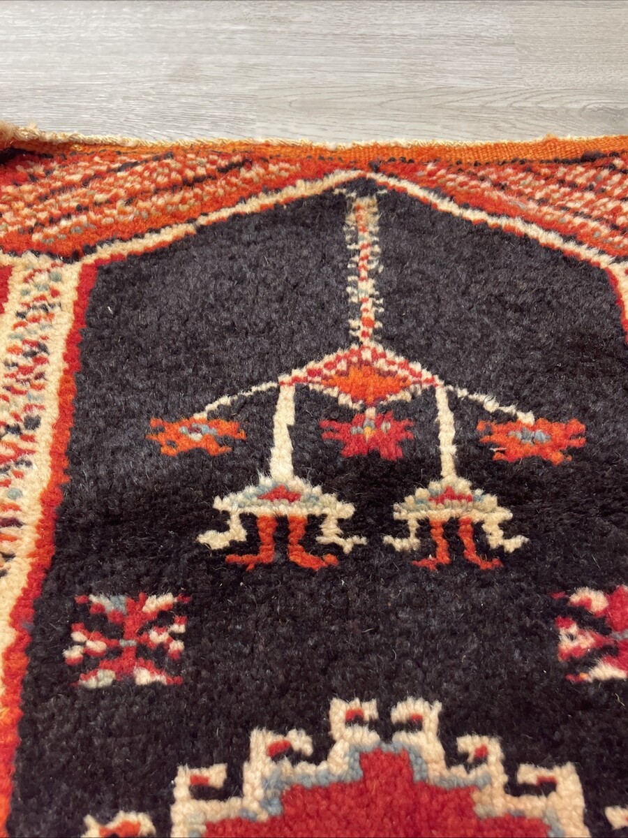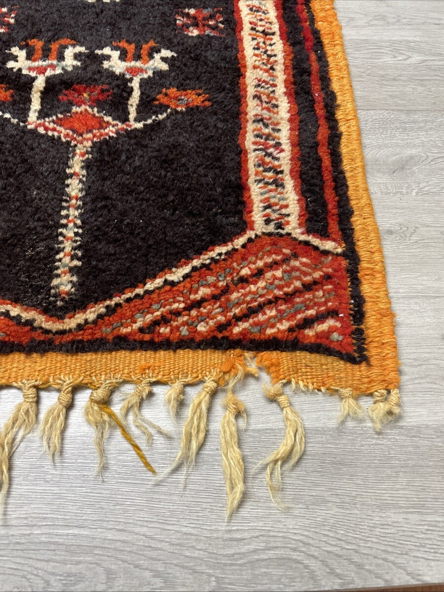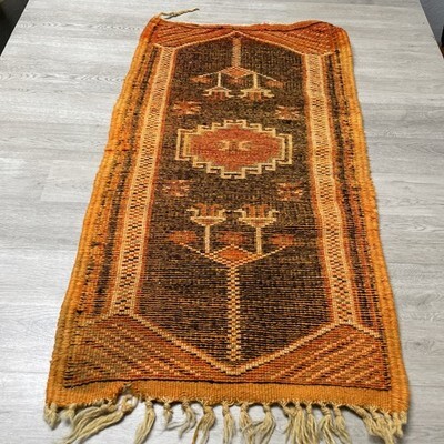 Good displayable condition. One of a kind hand woven rug, with knotted tassels at the edges. No stains but does have a few spots where the material is separating. The tassels on the end are fraying due to age and storage. Please see pictures for condition details and measurements.