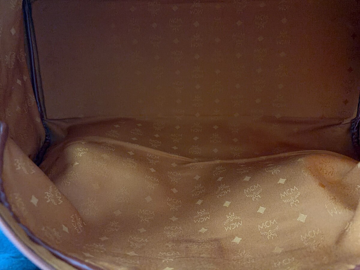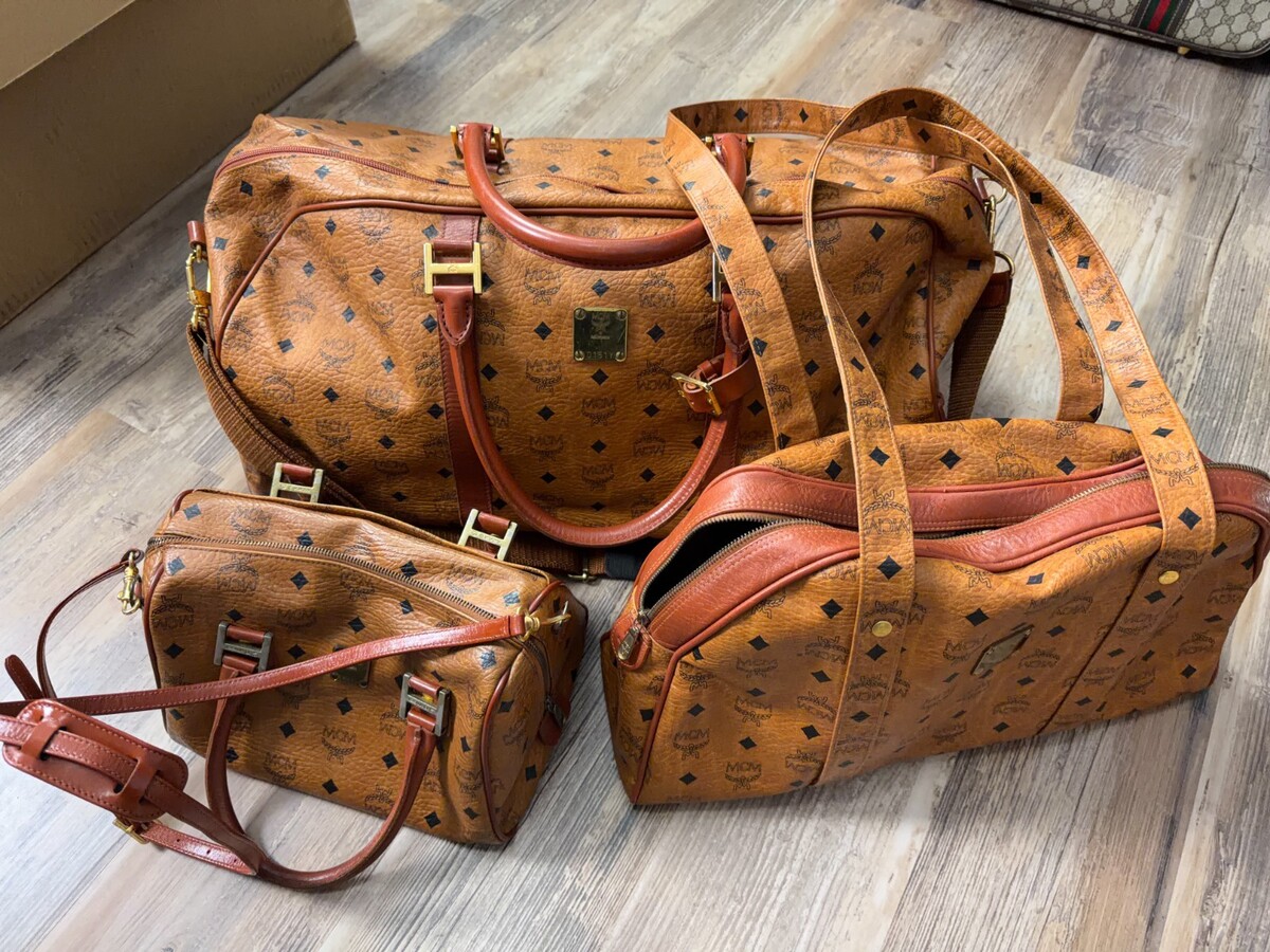 The MCM Cognac Boston Bag 3pc Set includes a large duffle bag, Boston bag and Half Moon shoulder bag, all made of leather with a fabric lining. The bags feature double brown leather handles, gold hardware accents, and inner pockets for organization. The Cognac exterior color with gold-plated hardware adds a touch of luxury to the designer set. Made in Germany, this set is perfect for women who appreciate high-quality craftsmanship and stylish design in their accessories.
