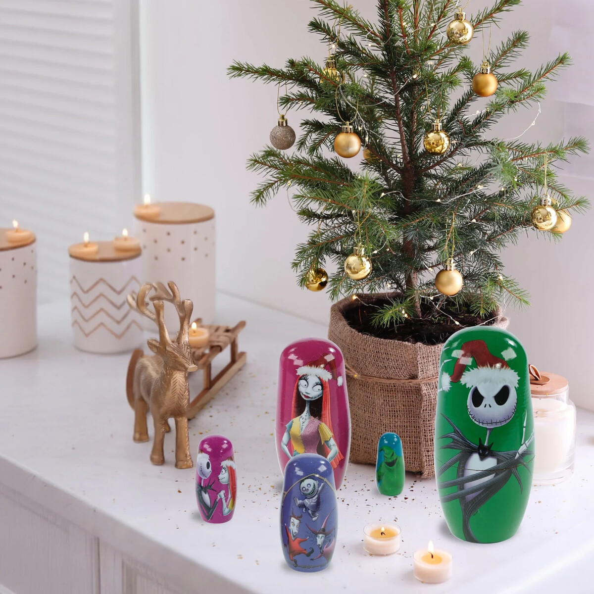 Discover the enchanting charm of Disney's The Nightmare Before Christmas with this exquisite 5-piece nesting doll set. Each piece in this decorative ensemble is intricately designed, showcasing beloved characters from the classic film. Made from durable Medium Density Fibreboard (MDF), these dolls boast vibrant colors and a smooth finish, ensuring they remain a cherished part of your holiday and everyday decor. Standing at 5.4 inches tall, they fit perfectly in any space, whether displayed together or separately. Dive into a world of whimsy and celebrate the season with this captivating collection.