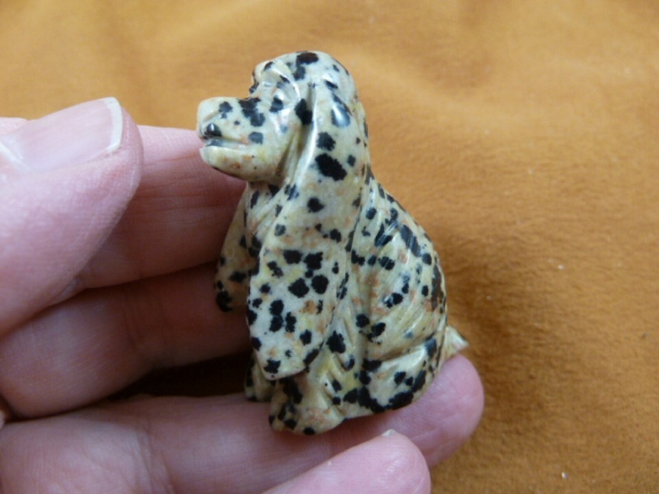 (internal #Y-DOG-CS-565) Excellent carving of a sitting COCKER SPANIEL in polished, natural SPOTTED BLACK WHITE DALMATIAN JASPER gemstone, carving is 1-5/8" tall, hand-carved in China. New, no defect. Great for the dog/Cocker collector!