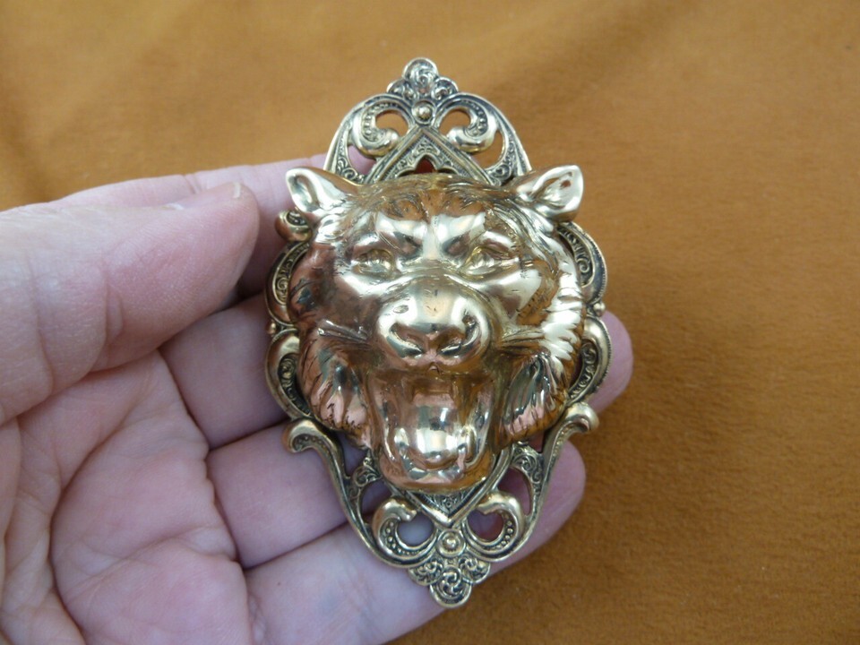 (Internal #B-PAN-2) This is a beautiful roaring panther head on a piece of - brass on second piece of oval brass with scrolled design, made into a pin/pendant (glued on the back), 3? long x 2" wide. This gorgeous - - stamped brass is antiqued, then buffed to create some shine.