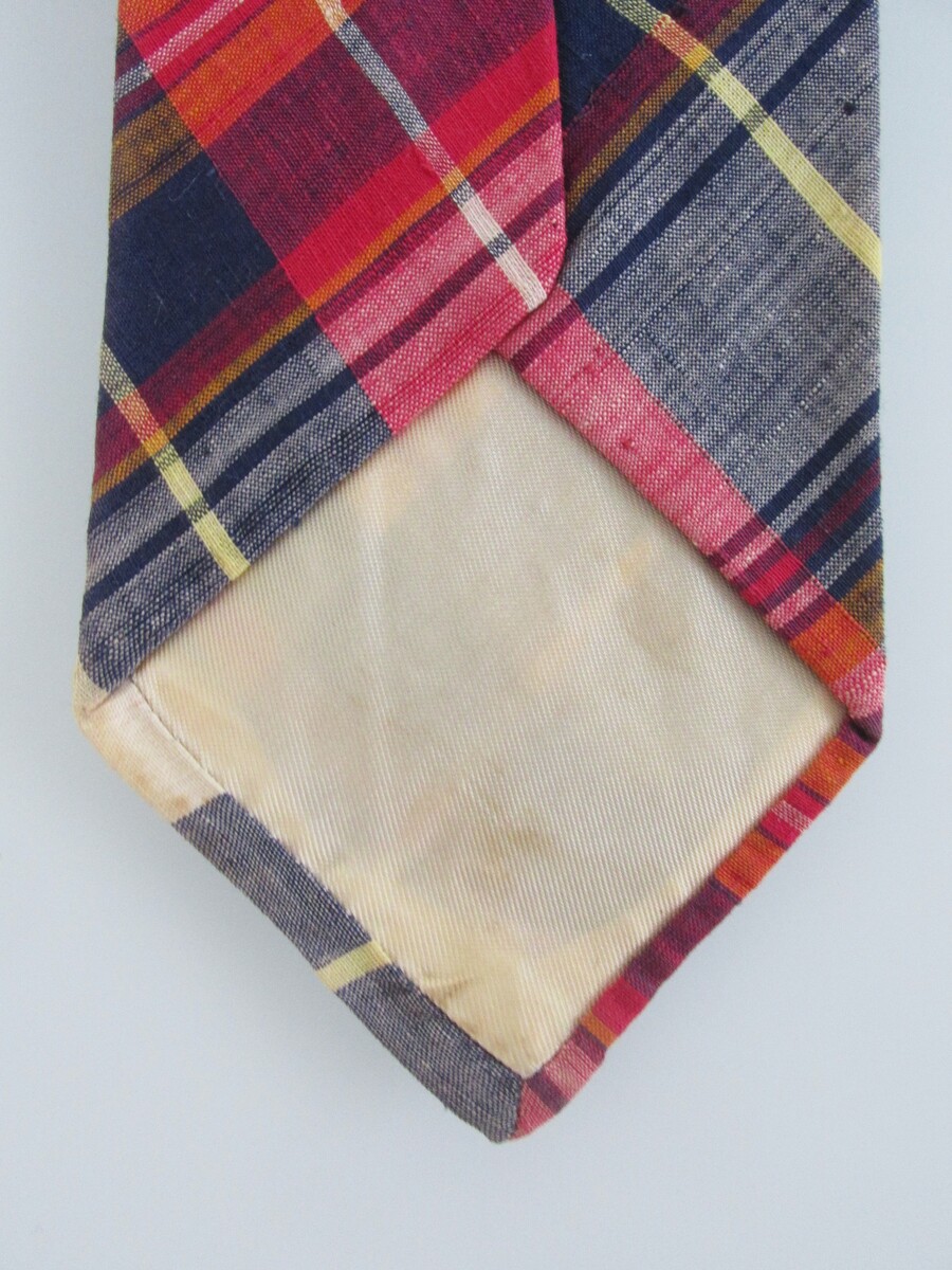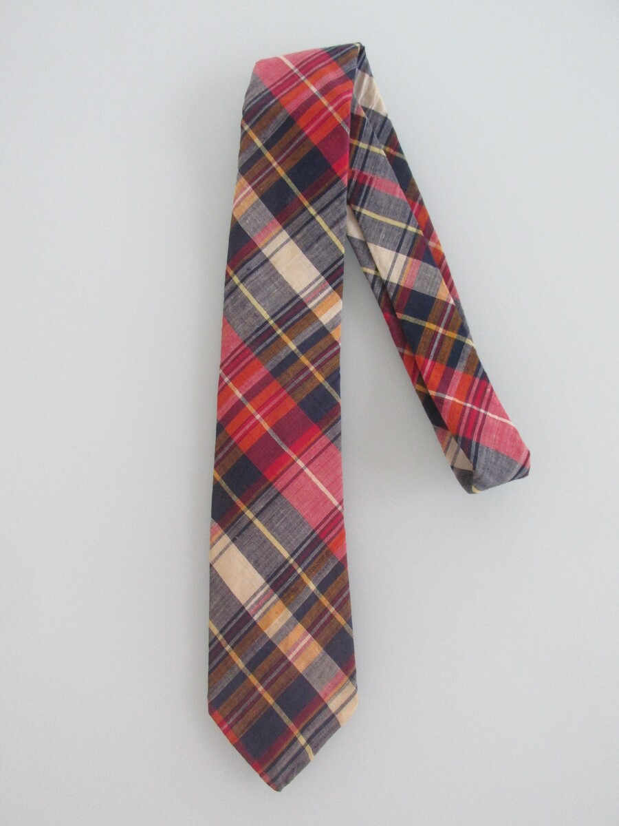 Description: Up for sale is a Kings Lynn vintage men's cotton madras tie. This tie is handmade in the USA of 100% cotton. The tie has a multicolored madras plaid design in red, blue, white, yellow tan. The dimensions are approximately 54" long x 3.25" wide. This tie is in excellent condition, but does have some very light soiling on the back of the blade. Please see picture #6.