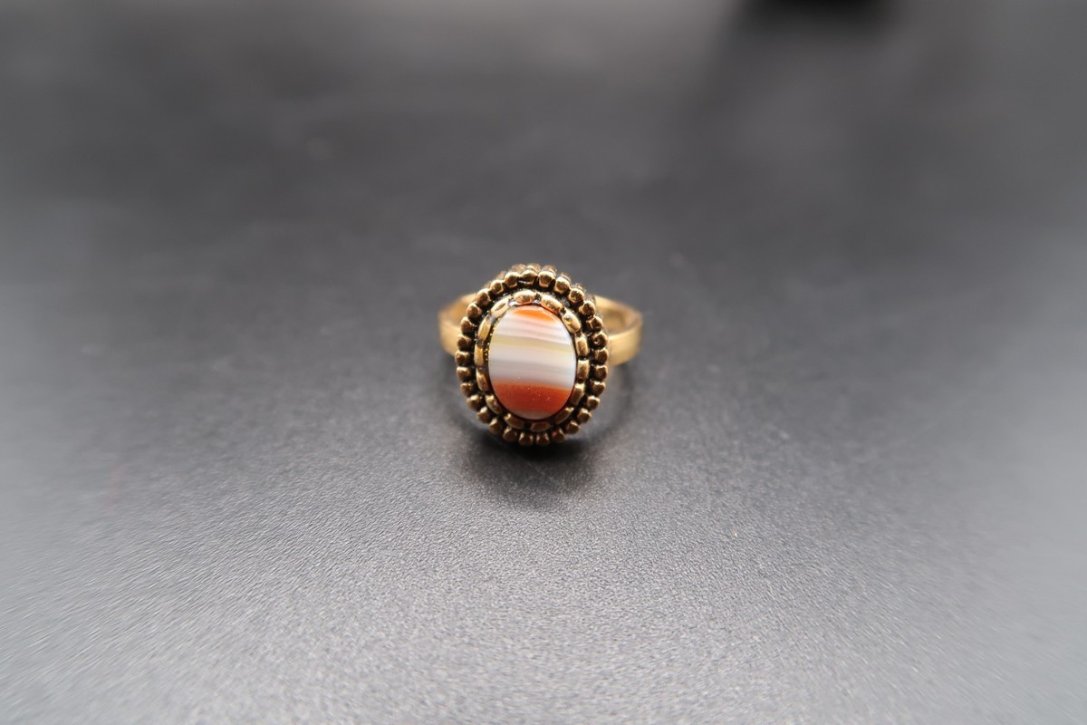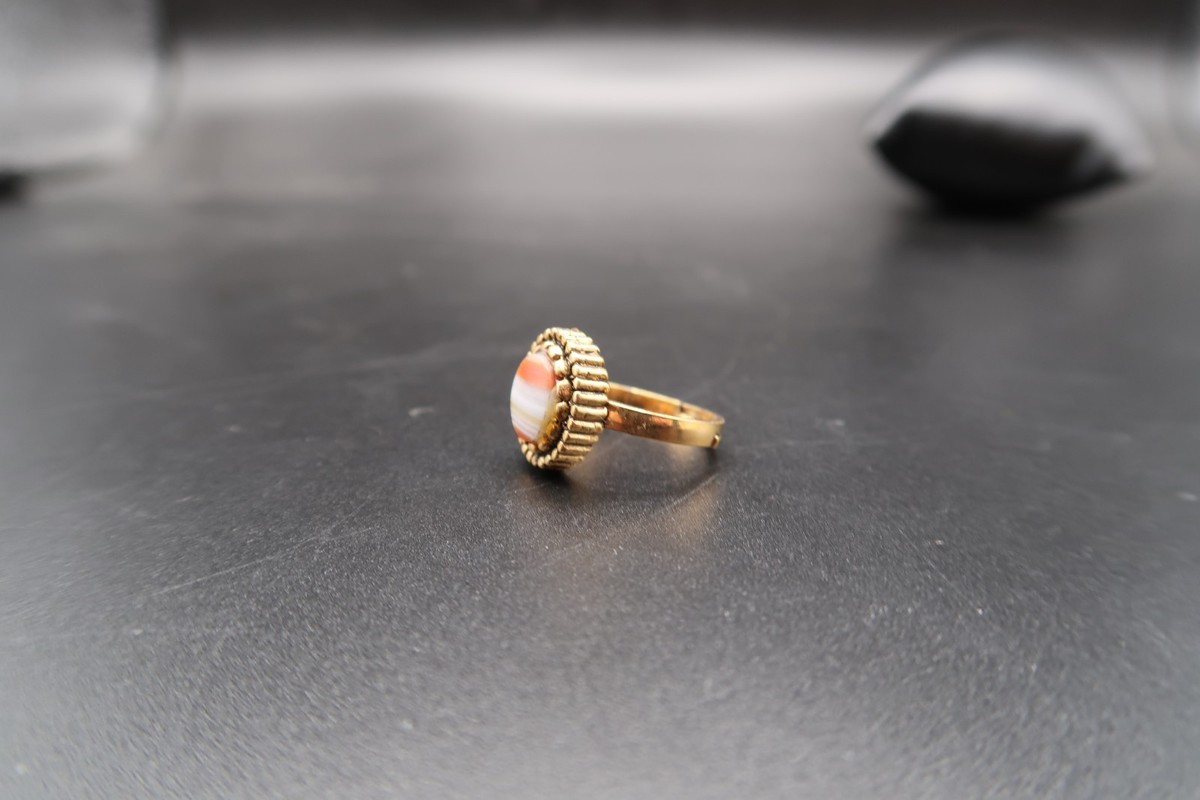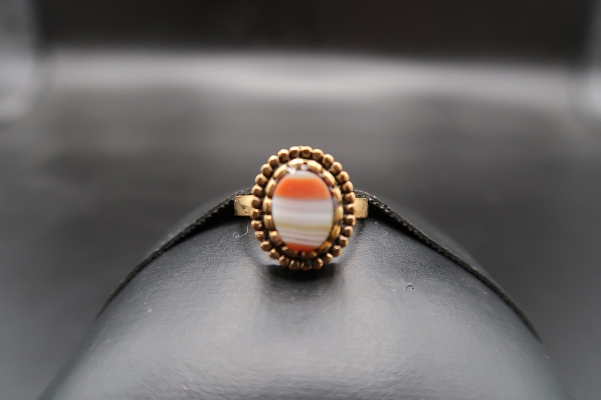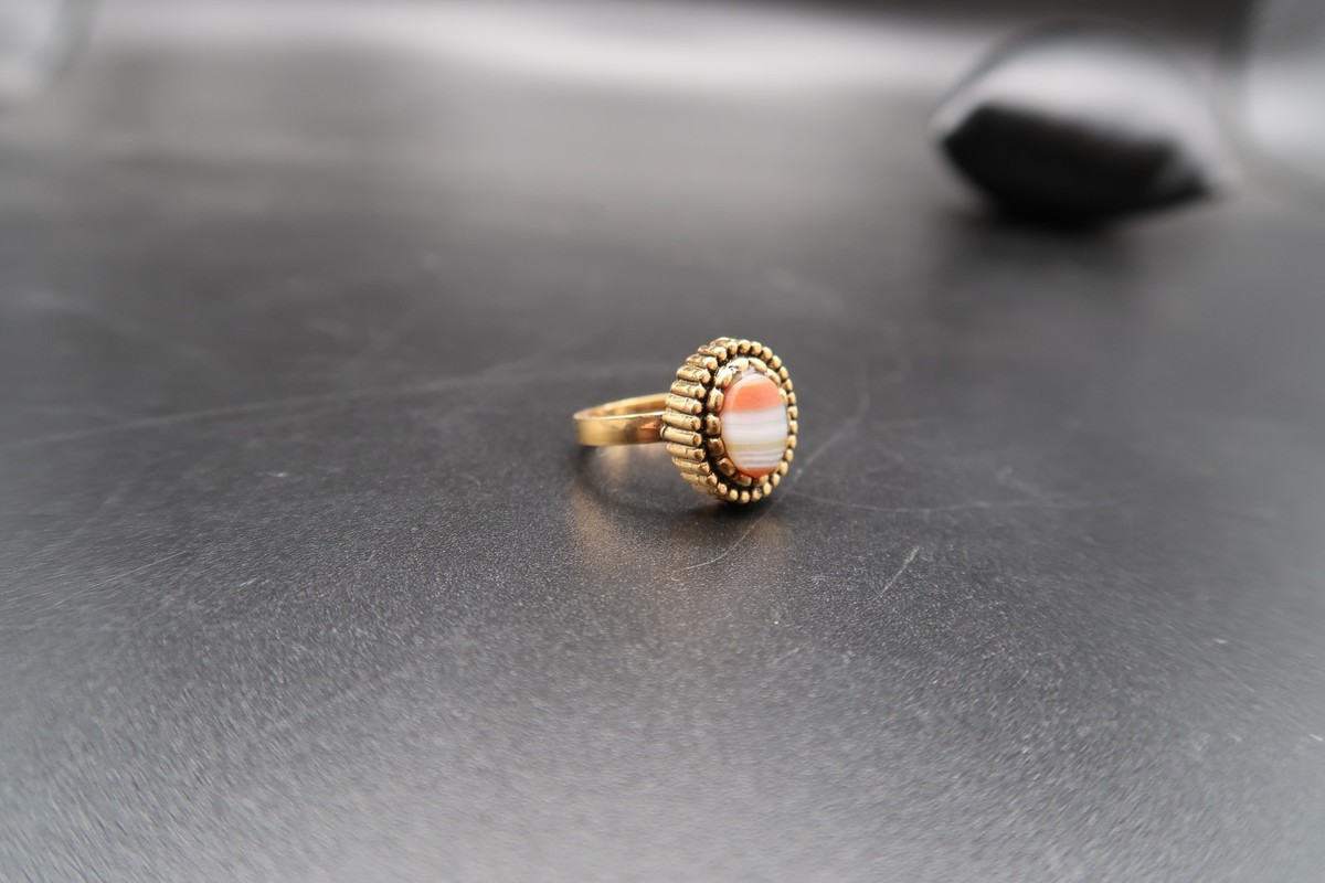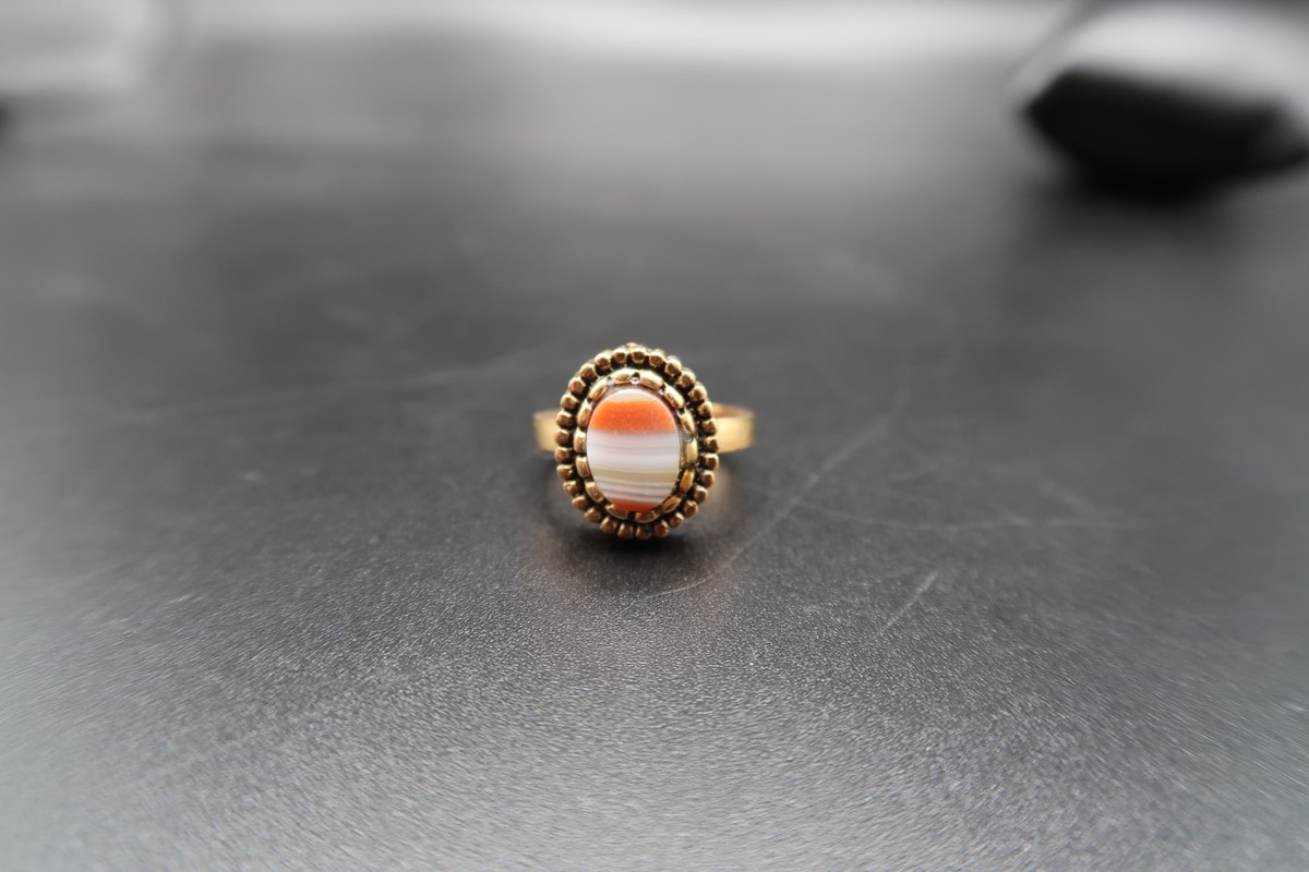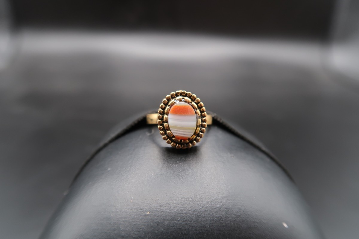 Vtg 10KT Gold Fill Ring w/ Oval Orange & White Banded Stone Cabachon Adjustable
