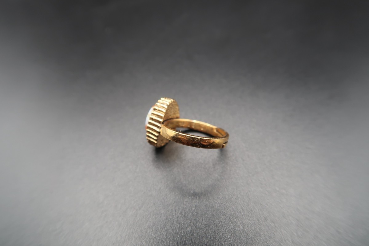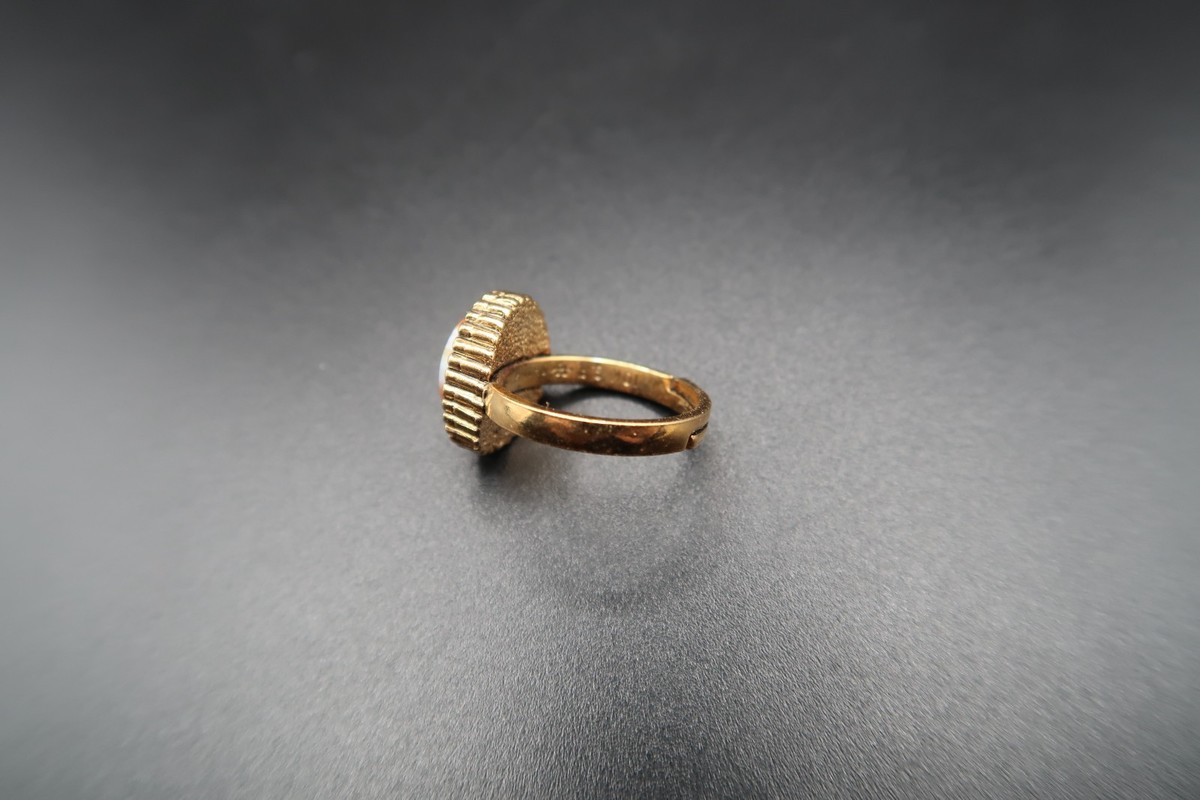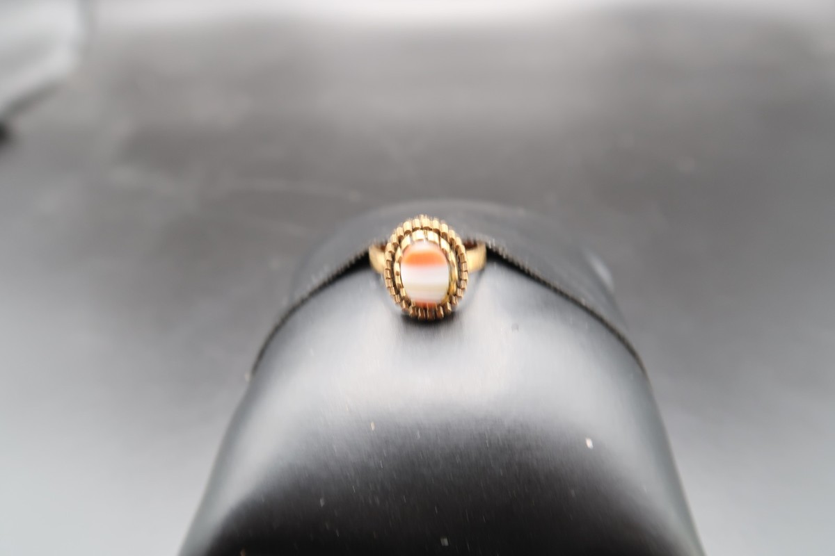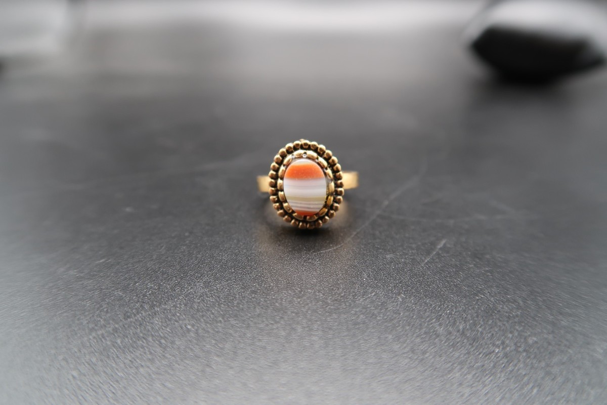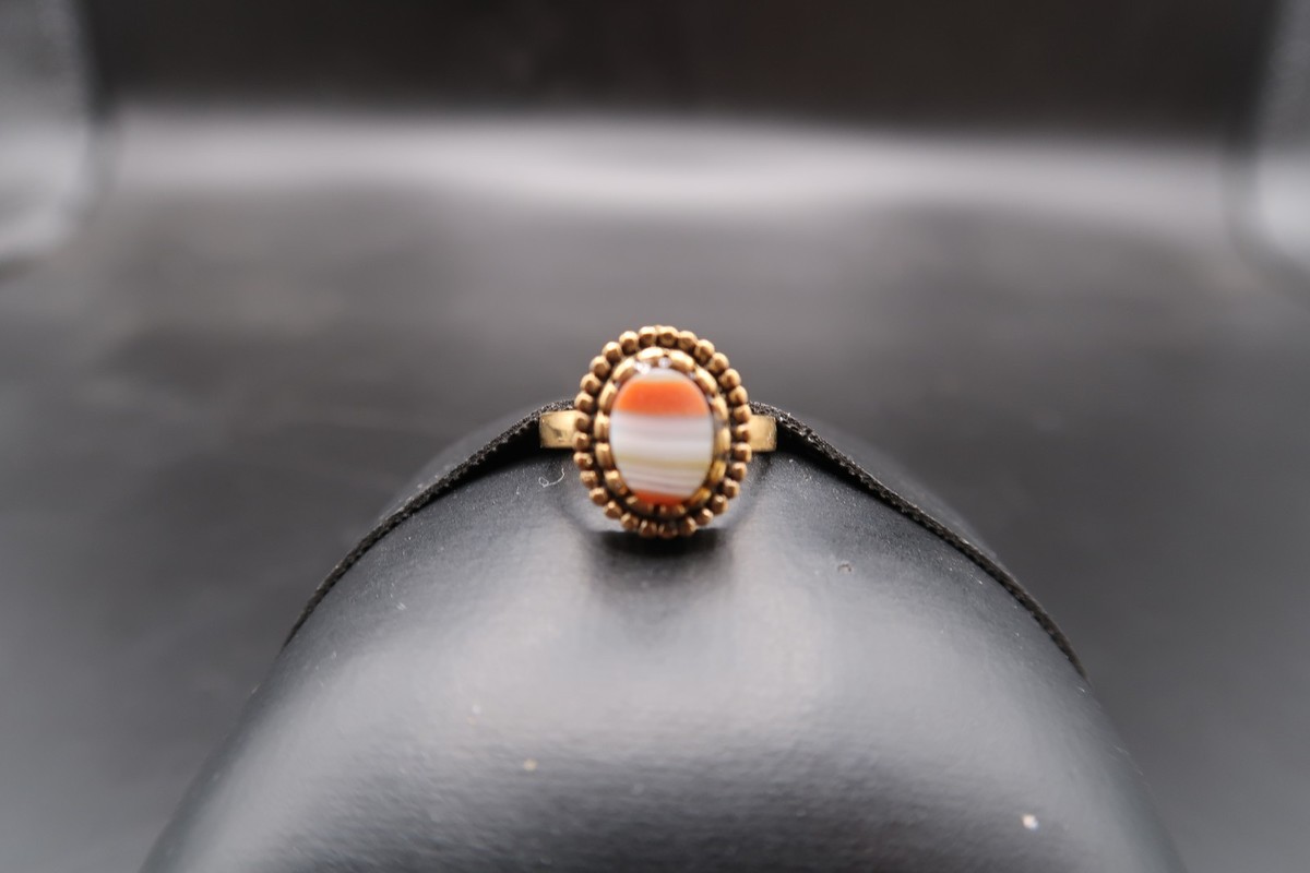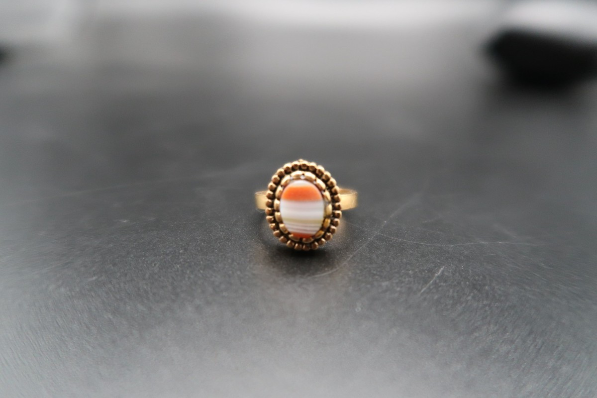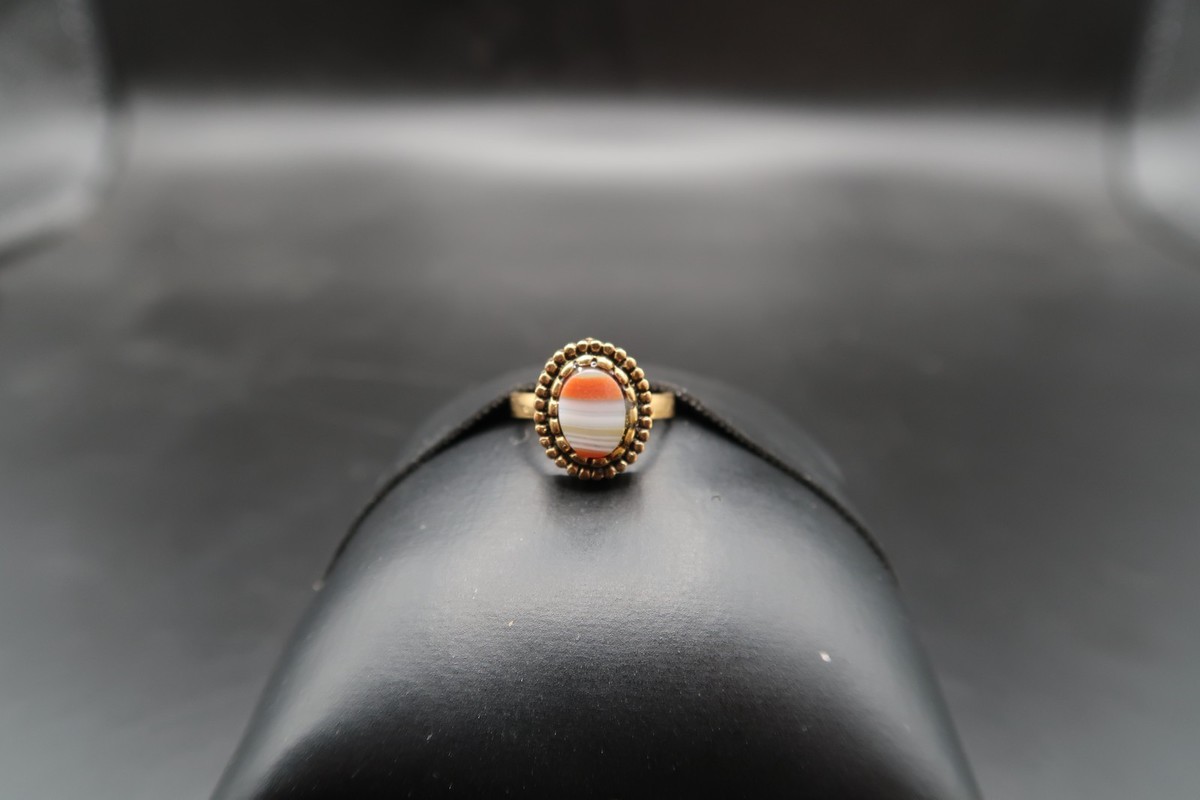 Vtg 10KT Gold Fill Ring w/ Oval Orange & White Banded Stone Cabachon Adjustable