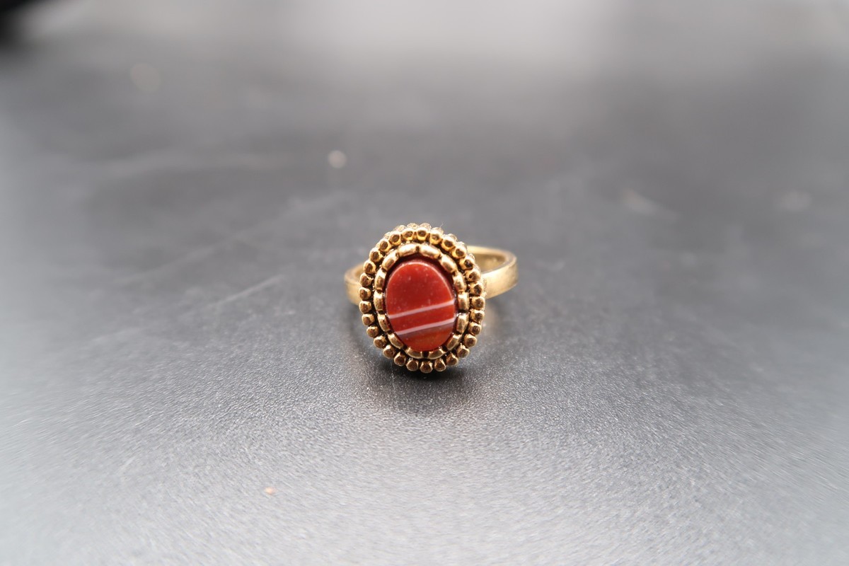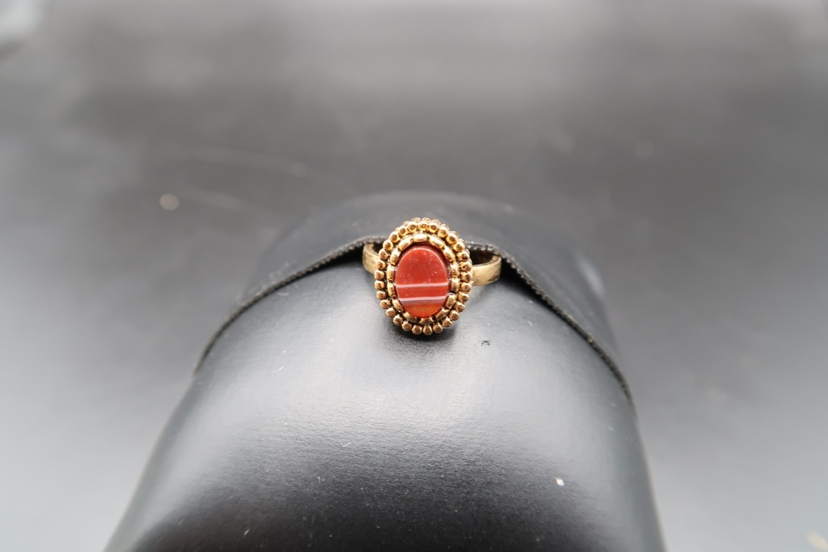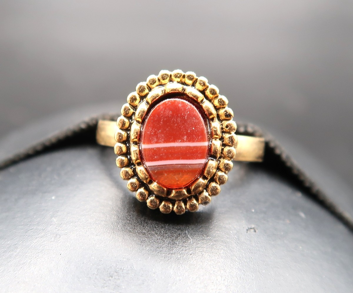 Vtg 10KT Gold Fill Ring w/ Oval Red & White Banded Cabachon Adjustable