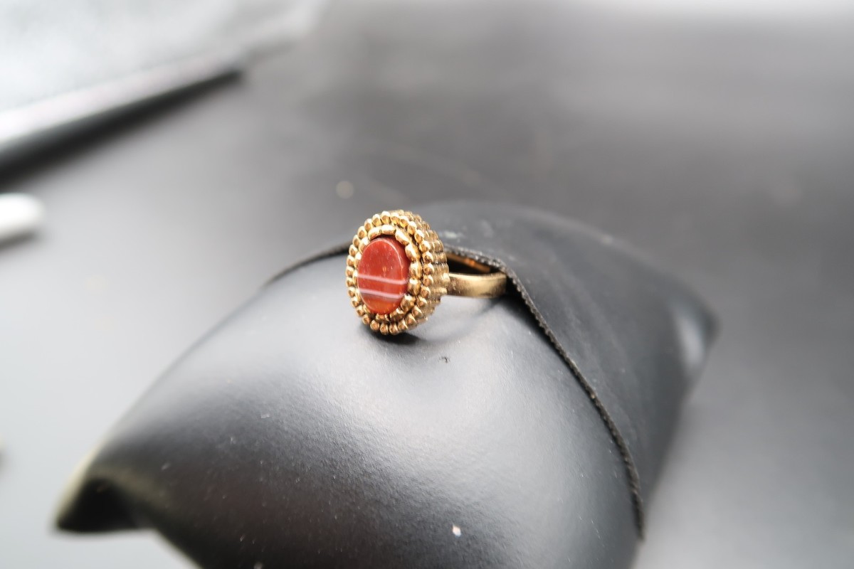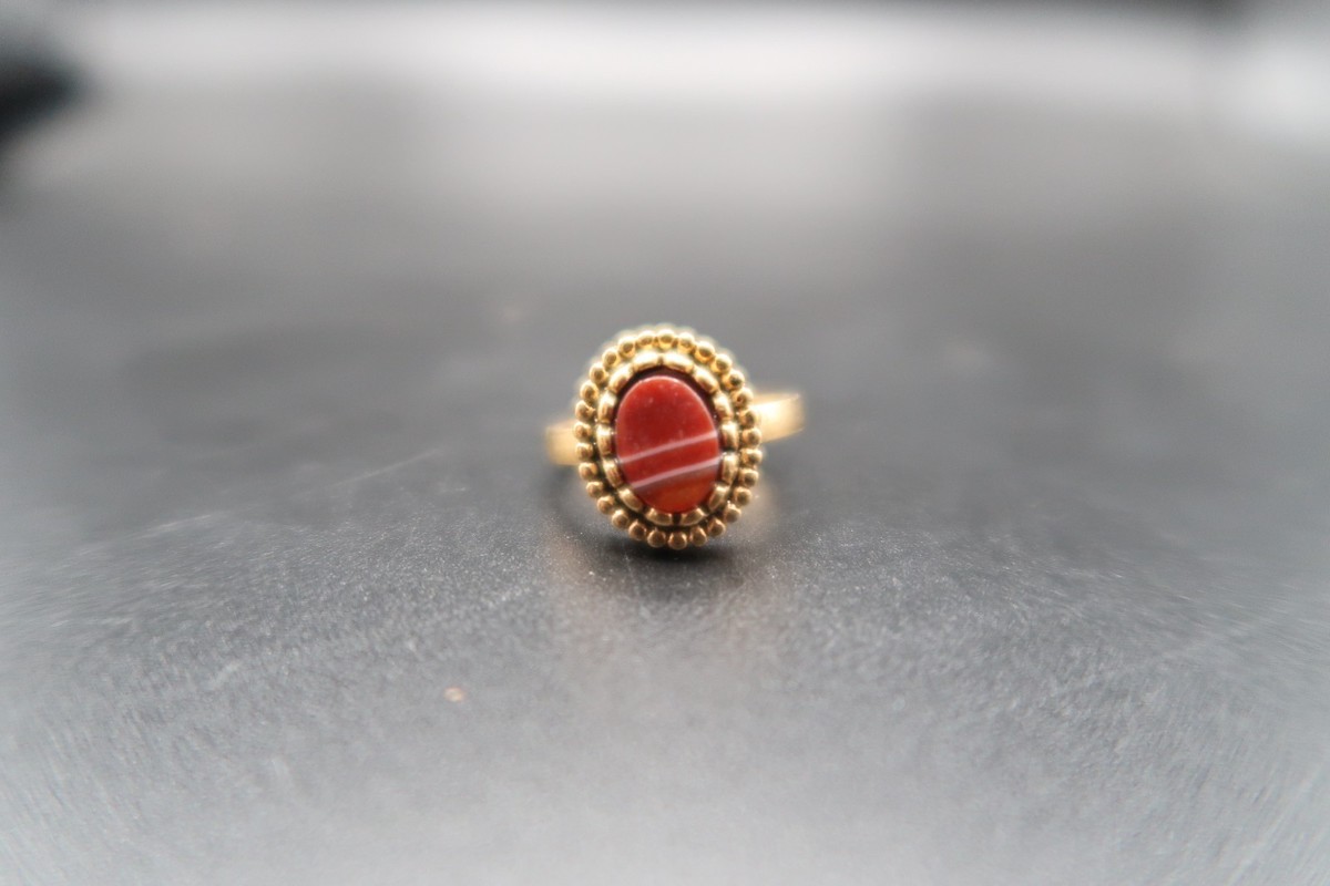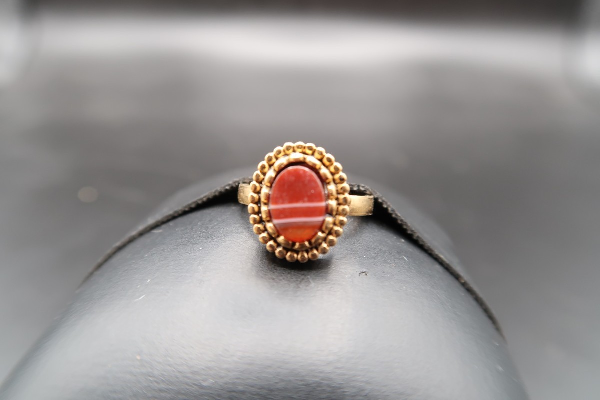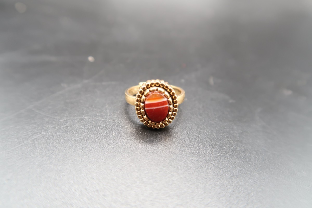 Vtg 10KT Gold Fill Ring w/ Oval Red & White Banded Cabachon Adjustable
