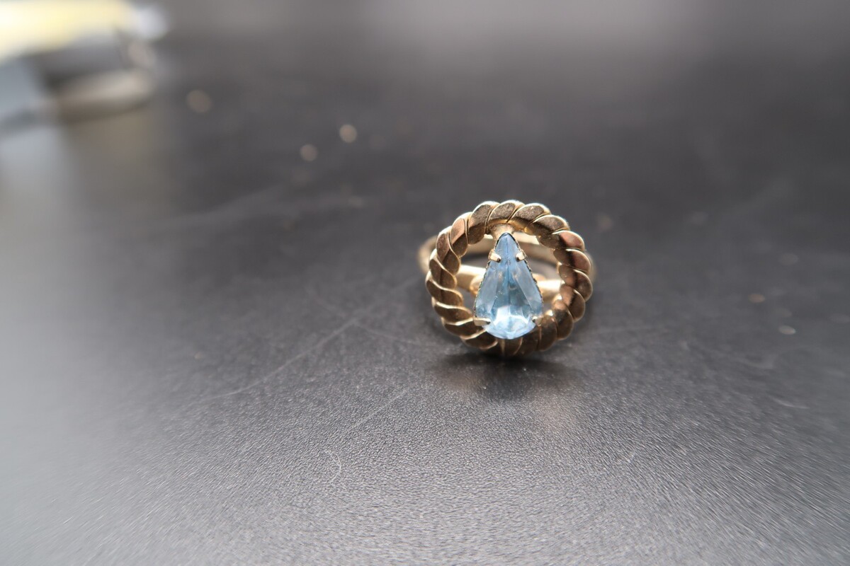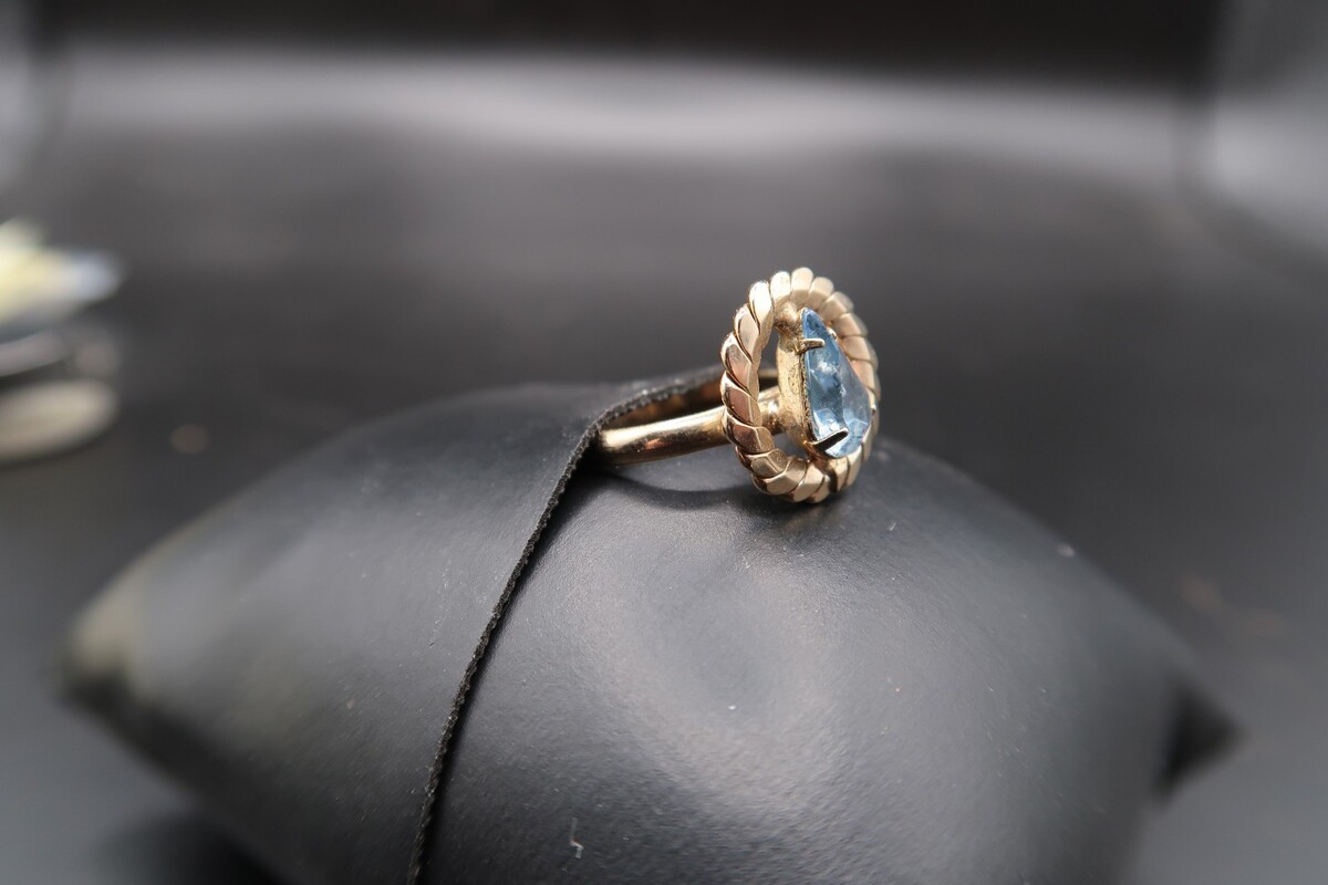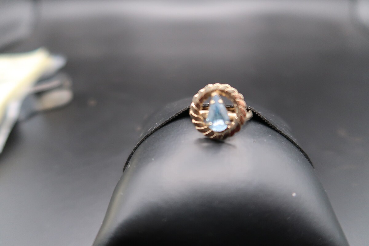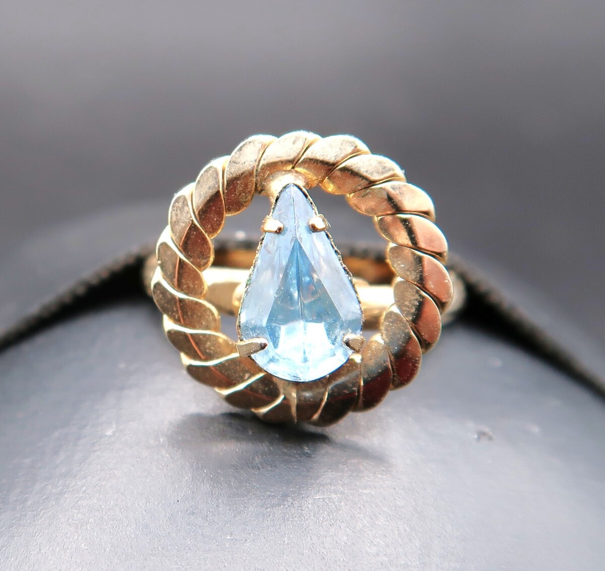 Vtg Gold Tone Adjustable Ring Pear Shape Prong Set Baby Blue Rhinestone