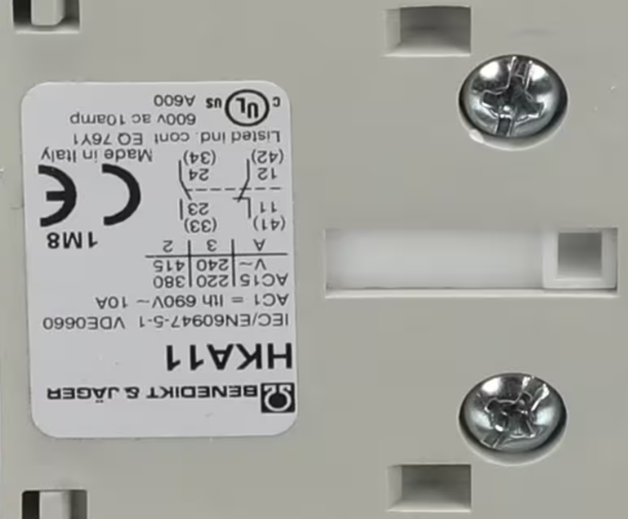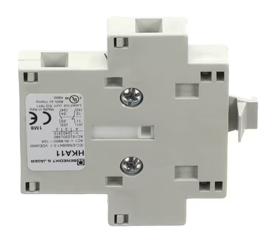 The Convotherm HKA11 Auxiliary Switch is a genuine OEM contact block designed for use with the main contactor in Convotherm Combi Steamers. Featuring 1 Normally Open (NO) and 1 Normally Closed (NC) contact, this auxiliary switch provides reliable signal feedback and control integration, supporting safe and consistent equipment operation.