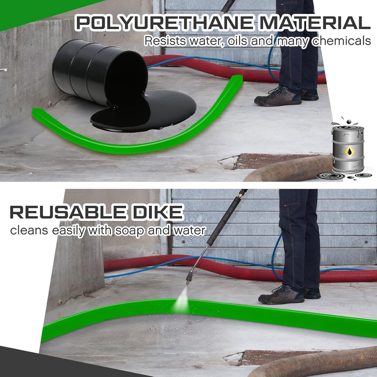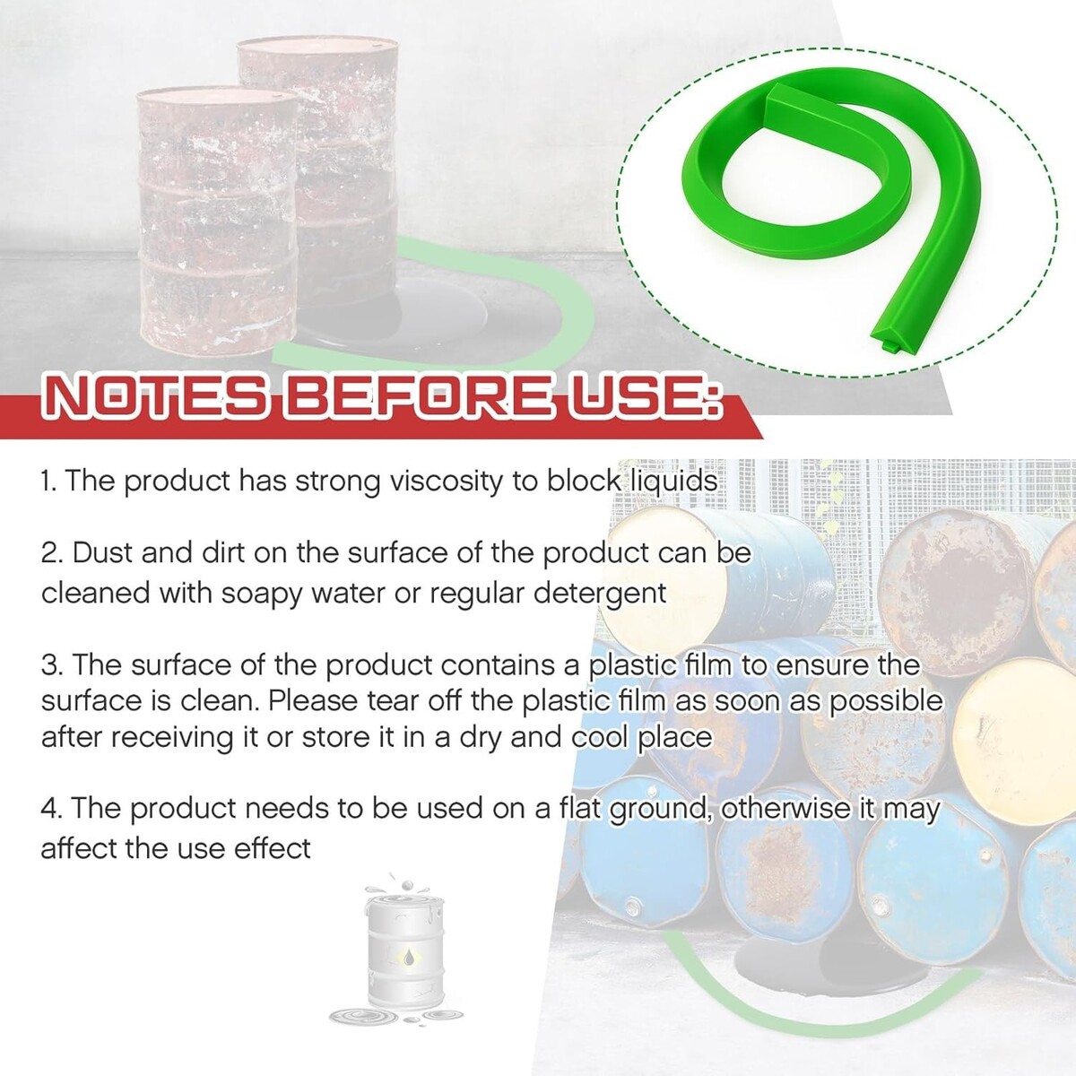 Resilient Design: comprised of 2 green polyurethane spill barrier(5'L x 2.6"W x 1.5"H), this spill barrier is water and oil resistant; It incorporates a protective plastic film on its surface implying that it should be stored in cool, dry conditions